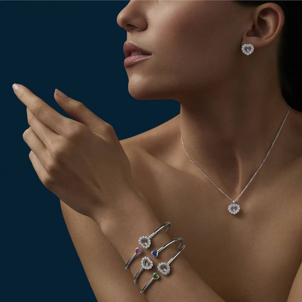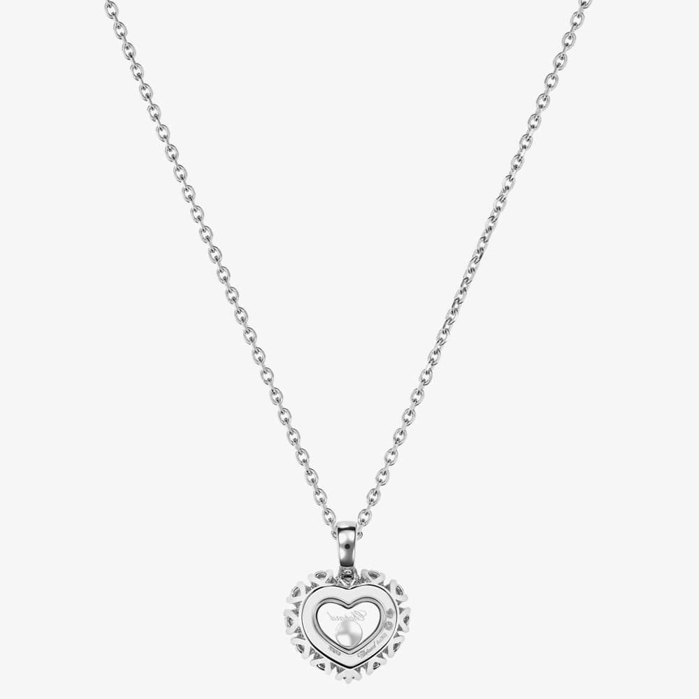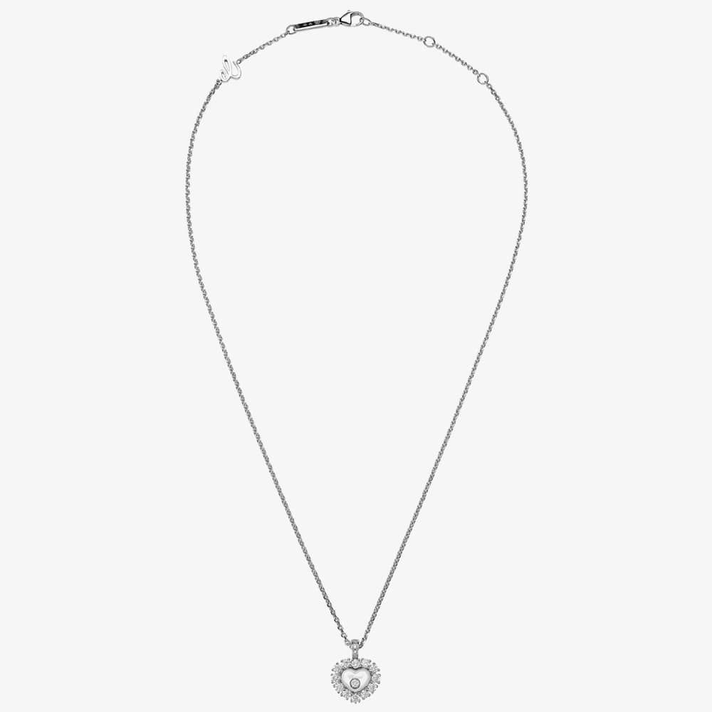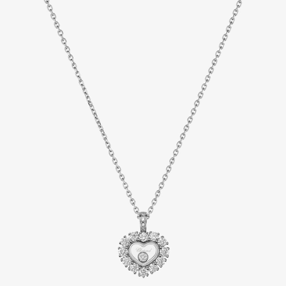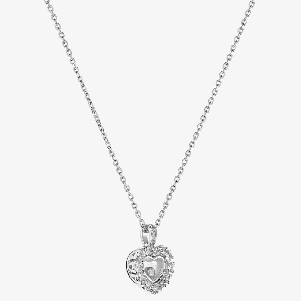 The Chopard Happy Diamonds Icons Joaillerie necklace is expertly crafted from ethical 18ct white gold, with a heart motif pendant adorned with twelve white round-cut diamonds around the case, with an additional four diamonds set into the bail. Inside the heart is a single diamond, entirely free between two sapphire crystals, enabling them to move without restraint. This beautiful pendant is suspended on an ethically sourced 18ct white gold adjustable belcher chain measuring 42cm in length, fastened with a lobster claw clasp. Little Diamonds Do Great Things. Diamond Weight: 0.64ct.