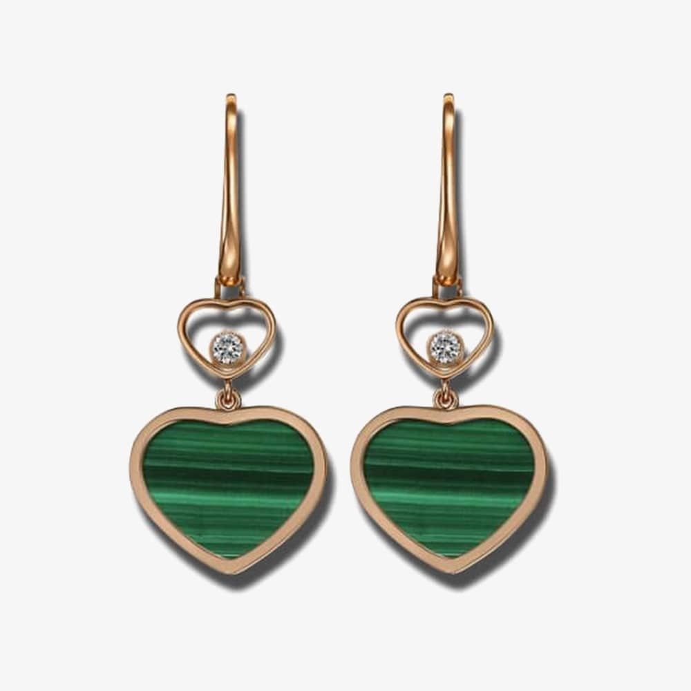 In Chopard's Happy Hearts collection, find these 18ct rose gold drop earrings with three hearts in a descending pattern. The smallest heart holds a total of 0.10ct brilliant cut 'dancing' diamond beneath a sapphire crystal overlay, a Maison signature. The other hearts are filled with green malachite, known for its negative energy-clearing properties. Crafted in 18ct rose gold, they pair wonderfully with the matching ring from the Chopard Happy Hearts collection.