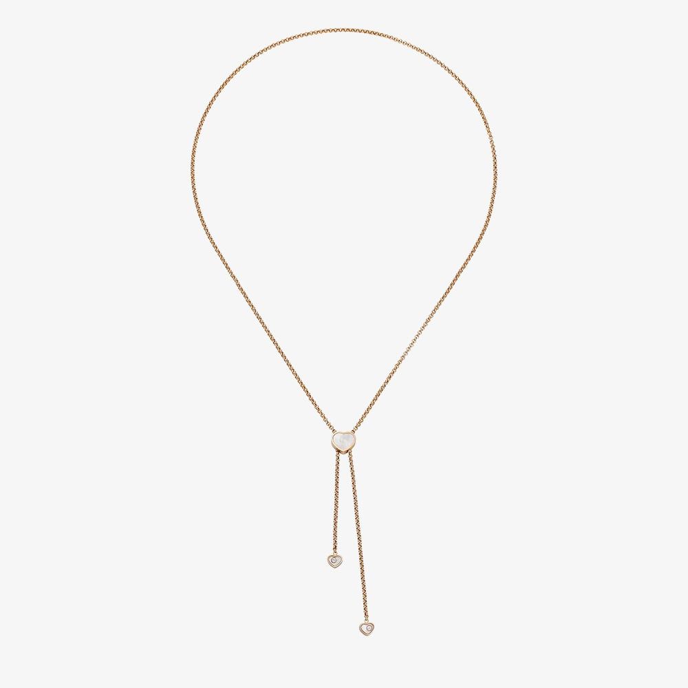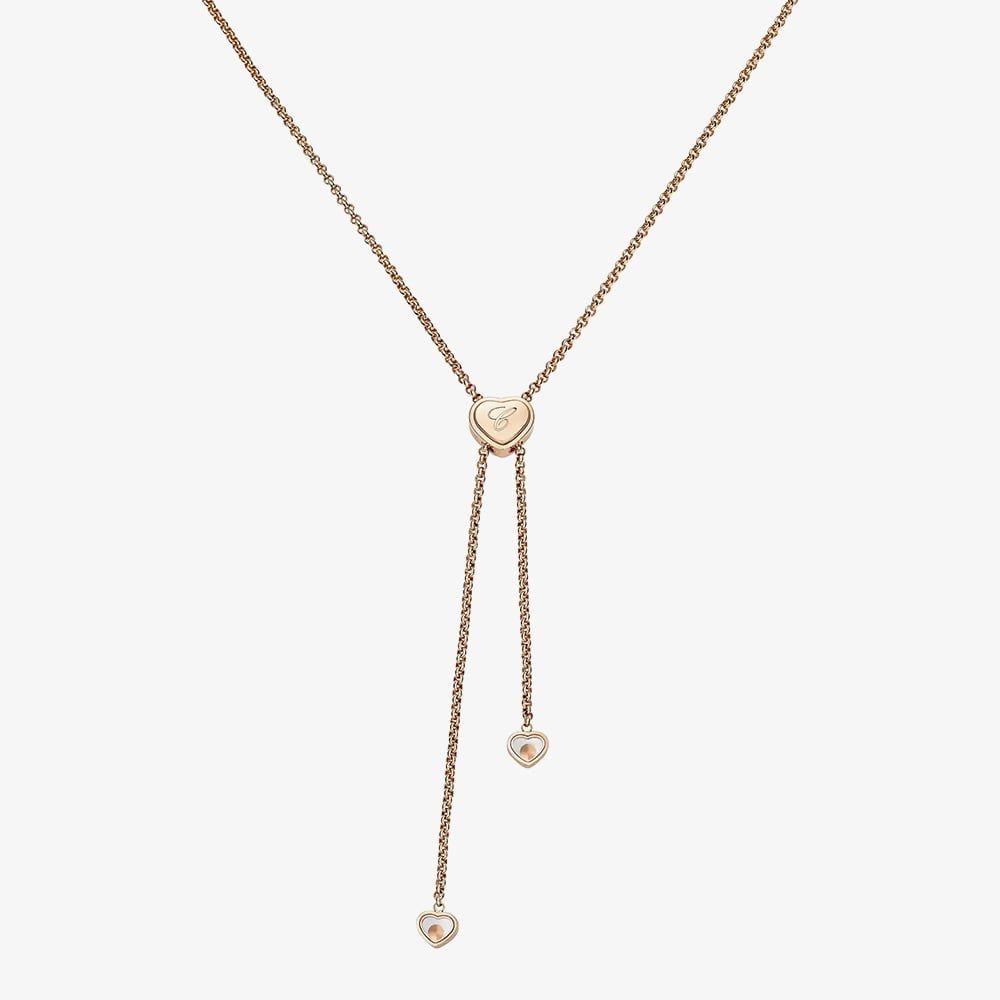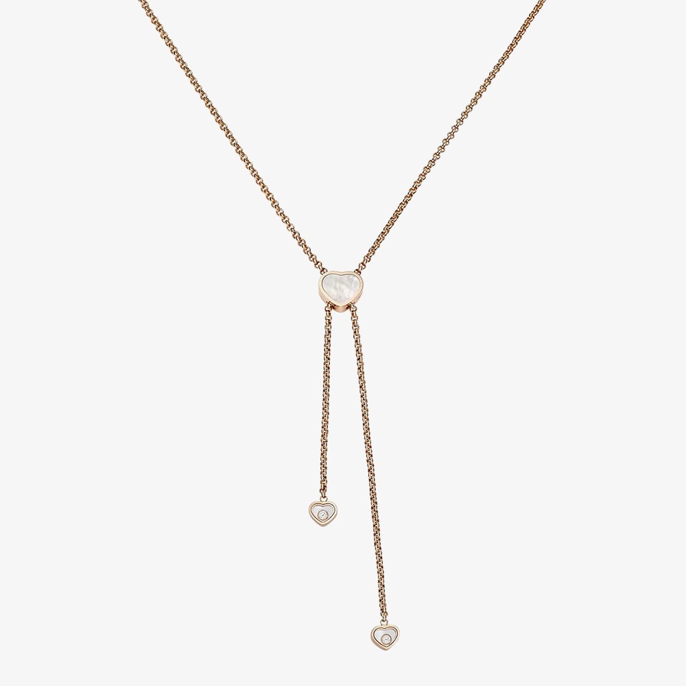 A graceful expression of Chopard’s big-hearted spirit, this exquisite necklace is crafted in luminous 18ct rose gold. At its centre, the Maison’s signature mother of pearl heart motif meets the timeless elegance of a dancing diamond, free to move, free to shine. From the iconic Happy Hearts collection, it is a radiant symbol of love, generosity, and feminine sophistication.