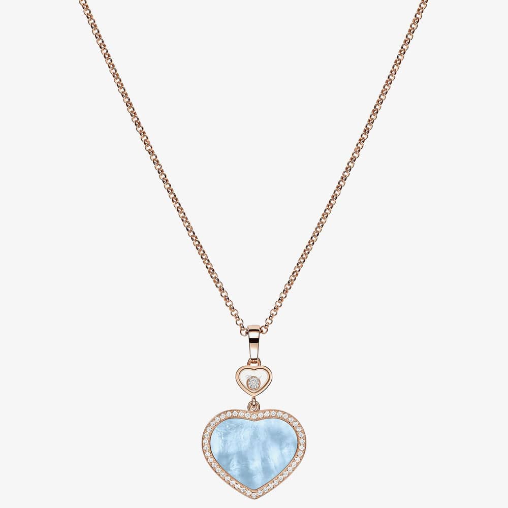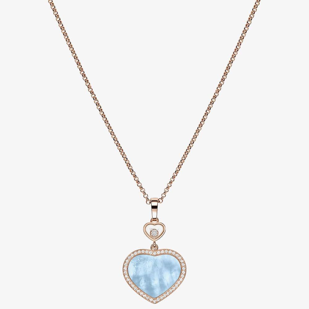 This stunning necklace is crafted with two suspended hearts, the first encasing a floating diamond and the second constructed in turquoise mother-of-pearl surrounded by diamonds. This necklace is suspended on an adjustable belcher chain measuring 45cm and fastened with a lobster claw clasp.