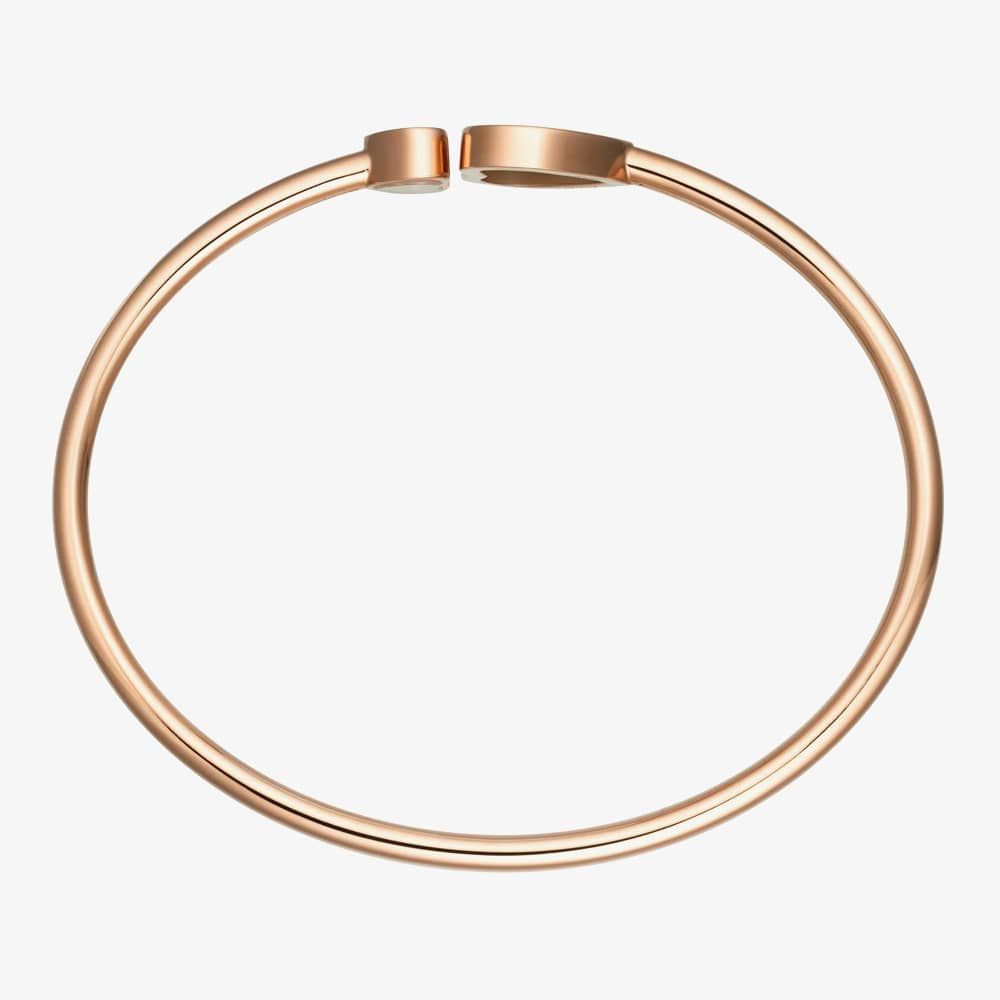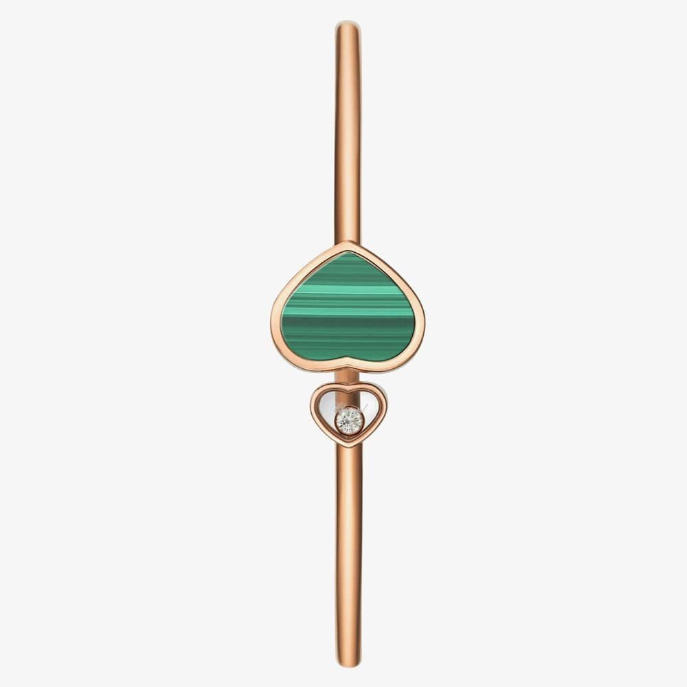 From the Happy Hearts collection, this stunning bangle is crafted in ethical 18ct rose gold and features two polished heart-shaped motifs, one filled with green malachite and the other includes a free-moving sparkling 0.05ct white brilliant cut diamond, set inside the crystal glass, which is free to move around and dance under the light. This elegant bangle is a perfect statement piece adding extra sparkle to any outfit. Little Diamonds Do Great Things.