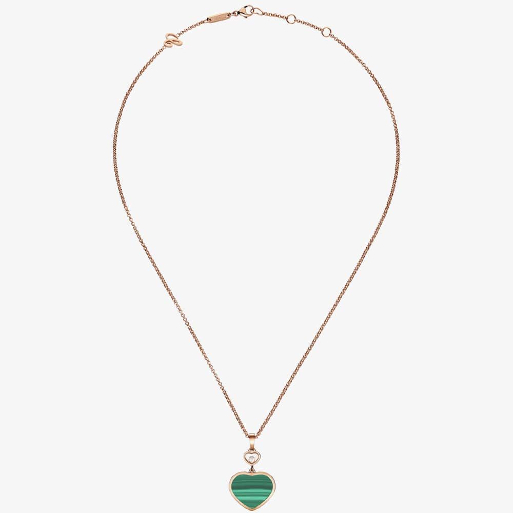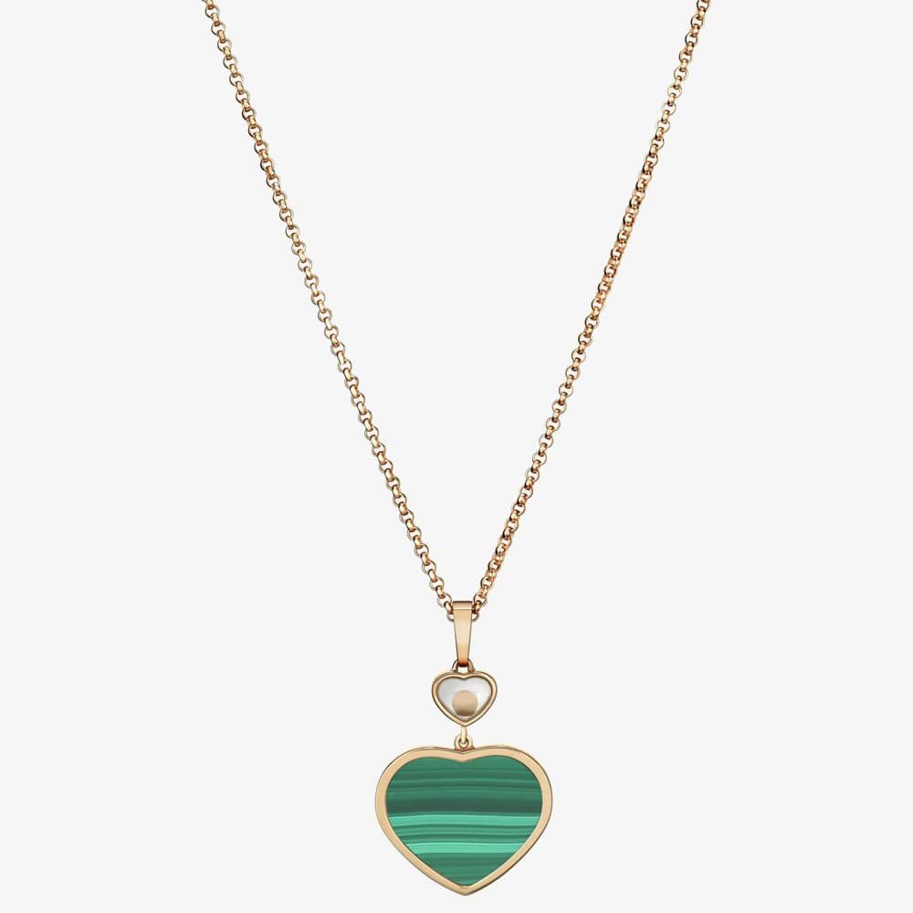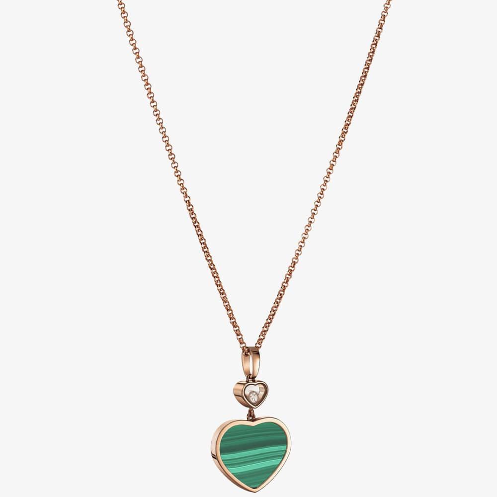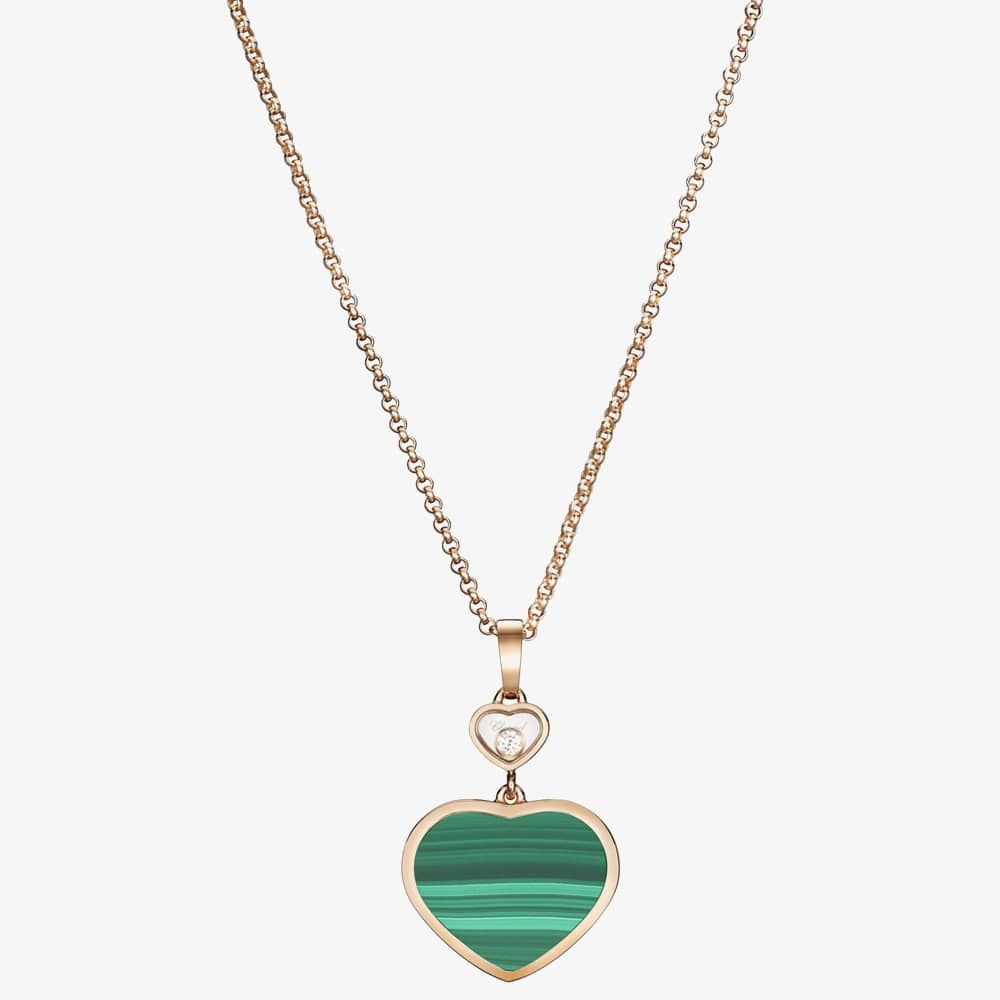 From the Happy Hearts collection, this stunning pendant necklace is crafted from ethical 18ct rose gold, with a heart motif pendant featuring a green malachite inlay with a singular free-moving 0.05ct white brilliant cut diamond suspended in a smaller heart above. The beautiful heart pendant is suspended on an 18ct rose-gold adjustable belcher chain measuring 45cm and fastened with a lobster claw clasp. Little Diamonds Do Great Things.