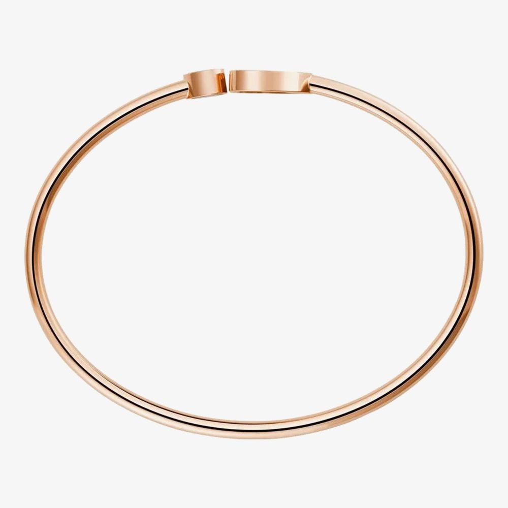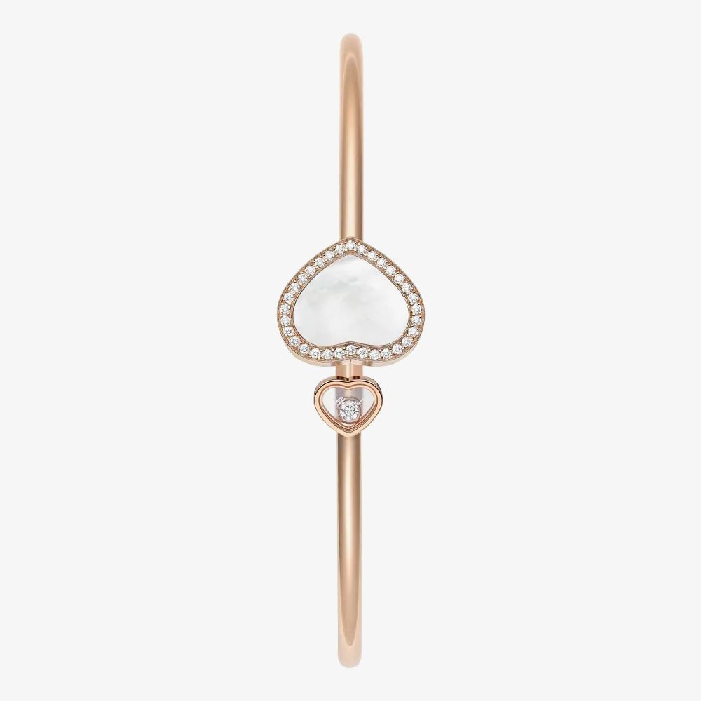 Inspired by the resilience and beauty of love, the Chopard Happy Hearts 18ct Rose Gold Mother of Pearl Bangle 85A074-5303 is a must-have for anyone seeking individual style and elegance. Made from a rigid 18ct rose gold open-style bangle, this delicate-looking bangle features two 18ct rose gold heart motifs embellished with white mother of pearl, 32 pave set diamonds and a 0.05ct free moving diamond set between sapphire glass in the Chopard 'dancing diamond' style, giving the wearer a full 0.19ct of diamond sparkle. Available in medium sizing with a 17cm inner diameter, this bangle is set to suit anyone.