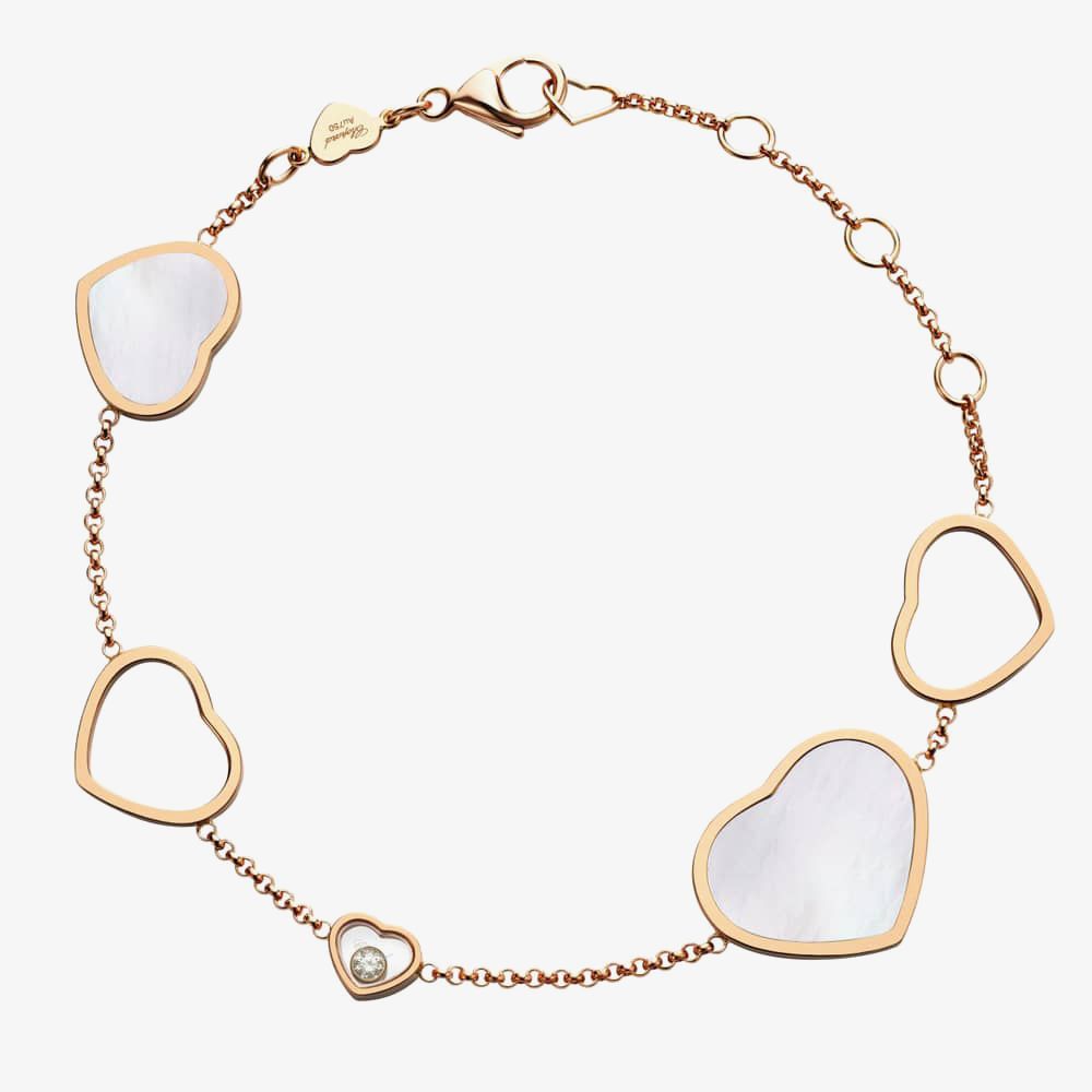 An adorably crafted ladies pearl bracelet which consists of rose gold hearts set on a delicate chain. Chopard's iconic moving diamond design can be seen set between two pieces of sapphire crystal for a glorious finish. The bracelet fastens using a secure lobster clasp which latches on to an open heart shaped edge.