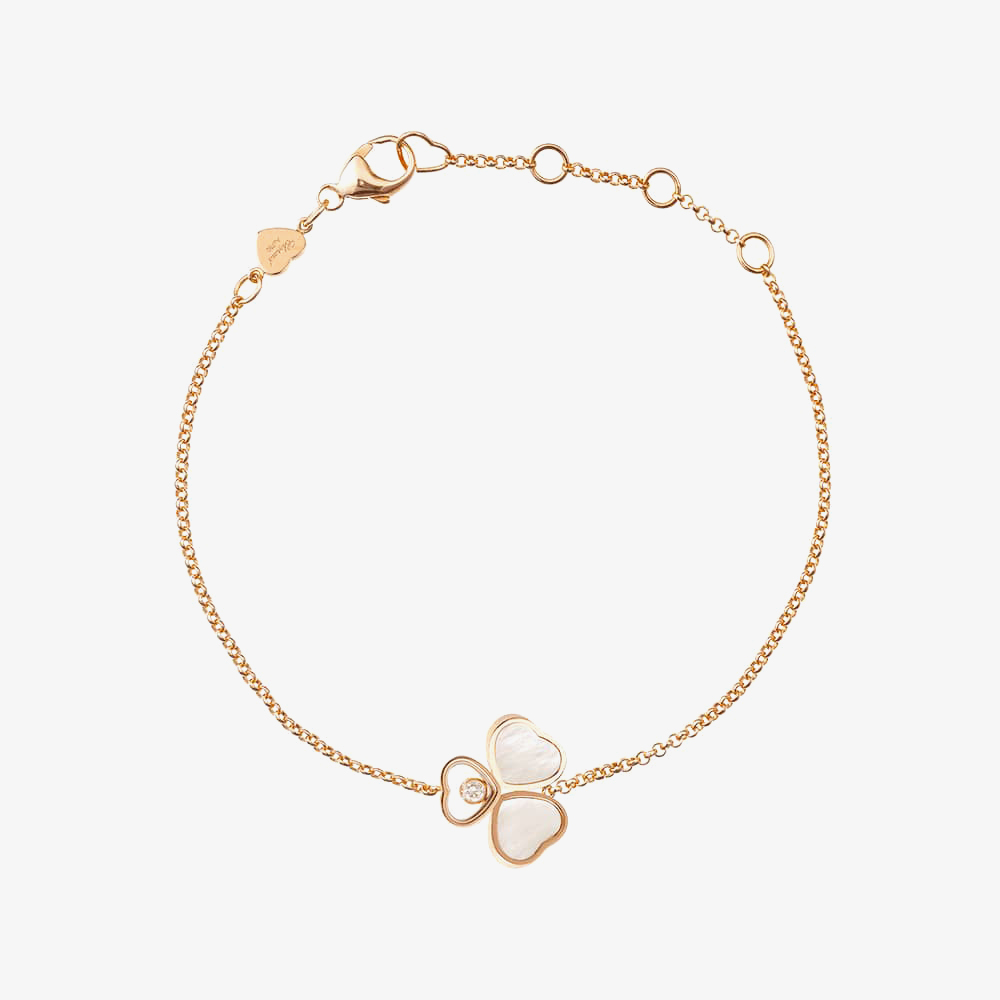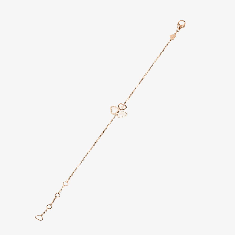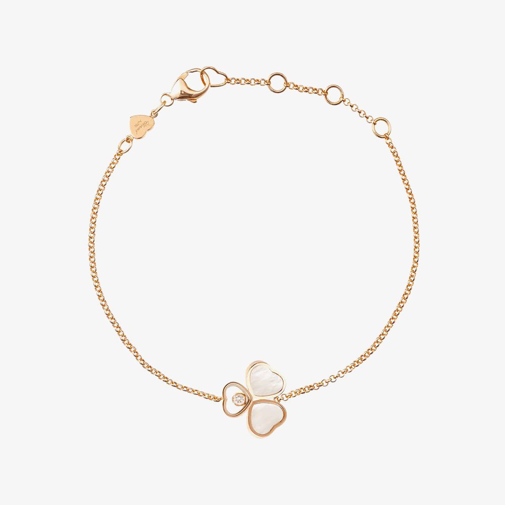 Crafted in 18ct rose gold, this mother of pearl heart talisman is surrounded by two iconic dancing diamonds. The Happy Hearts collection unites big hearted women around the world.