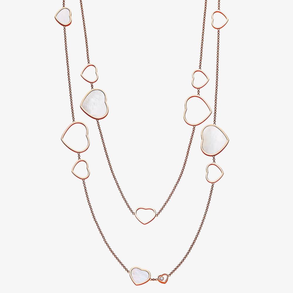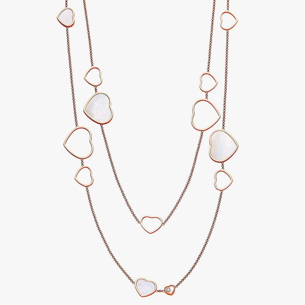Complete the look with this stunning ladies necklace. Offering a double chain design complete with a mixture of open work and mother of pearl filled hearts crafted from 18ct rose gold. The perfect gift for someone special, the necklace also features three 0.15ct floating diamonds which will add a hint of sparkle to any occasion. Wear individually for a true statement or pair with matching items from the Happy Hearts collection for the perfect finish to any outfit.