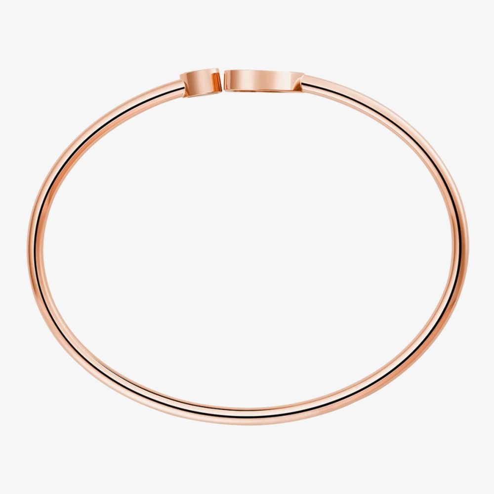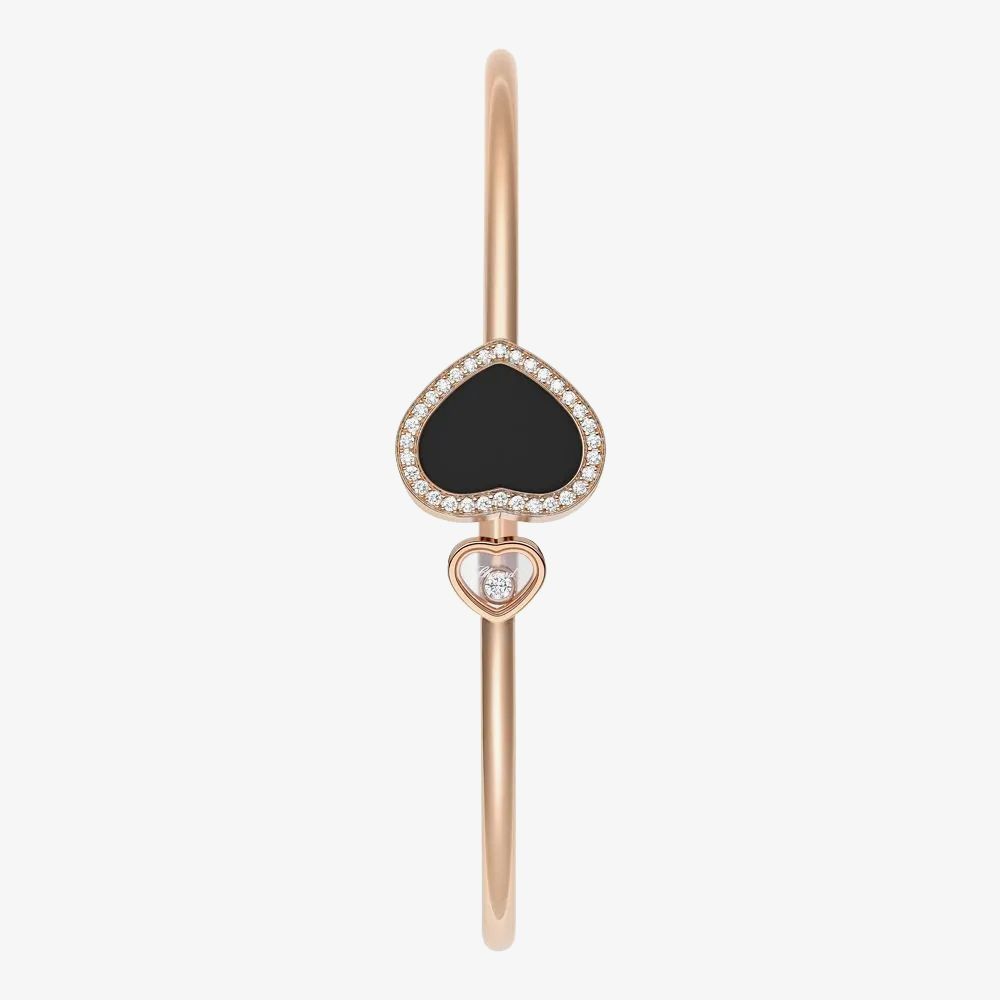 Inspired by the resilience and beauty of love, the Chopard Happy Hearts 18ct Rose Gold Onyx and Diamond Bangle 85A074-5203 is a must-have for anyone seeking individual style and elegance. Made from a rigid 18ct rose gold open-style bangle, this delicate-looking bangle features two 18ct rose gold heart motifs embellished with onyx, 32 pave set diamonds and a 0.05ct free moving diamond set between sapphire glass in the Chopard 'dancing diamond' style, giving the wearer a full 0.19ct of diamond sparkle. Available in medium sizing with a 17cm inner diameter, this bangle is set to suit anyone.