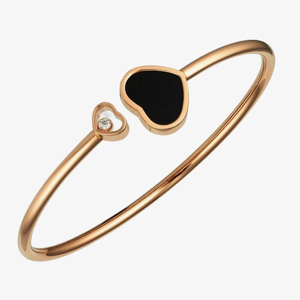 Featuring a solid black onyx stone set in the centre of the larger heart design which contrasts with the free moving diamond stone. Resting comfortably on an 18ct rose gold bangle. Wear individually or pair with matching items from the Happy Hearts collection to complete your look.