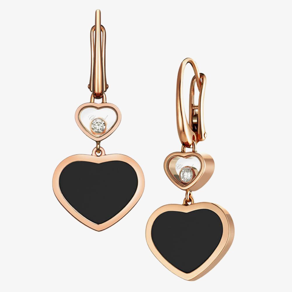 Add a sense of style and sophistication to your evening wear with these luxurious rose gold dropper earrings from Chopard. Featuring a dark onyx set heart shape design complete with a smaller moving diamond resting inbetween the layers of sapphire crystal.
