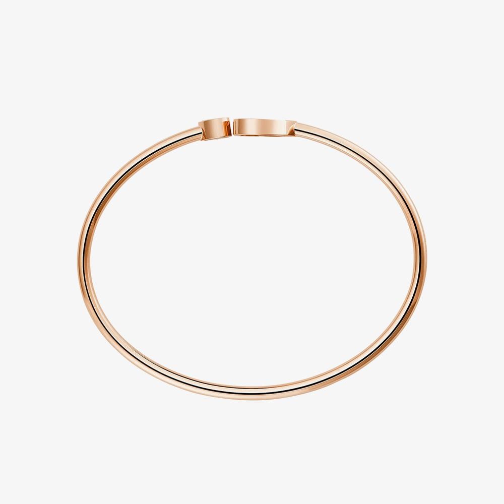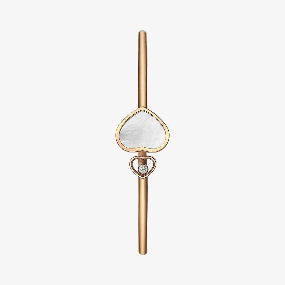Delicately crafted in 18ct rose gold, this refined bangle from Chopard’s Happy Hearts collection is a graceful expression of feminine elegance. One end features a larger heart in luminous mother-of-pearl, radiating softness and serenity, while the other showcases a smaller heart housing a signature floating diamond, gently dancing between sapphire crystals.