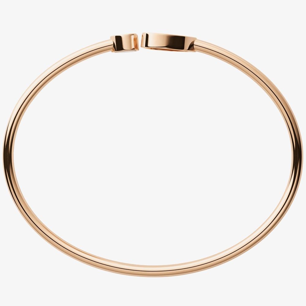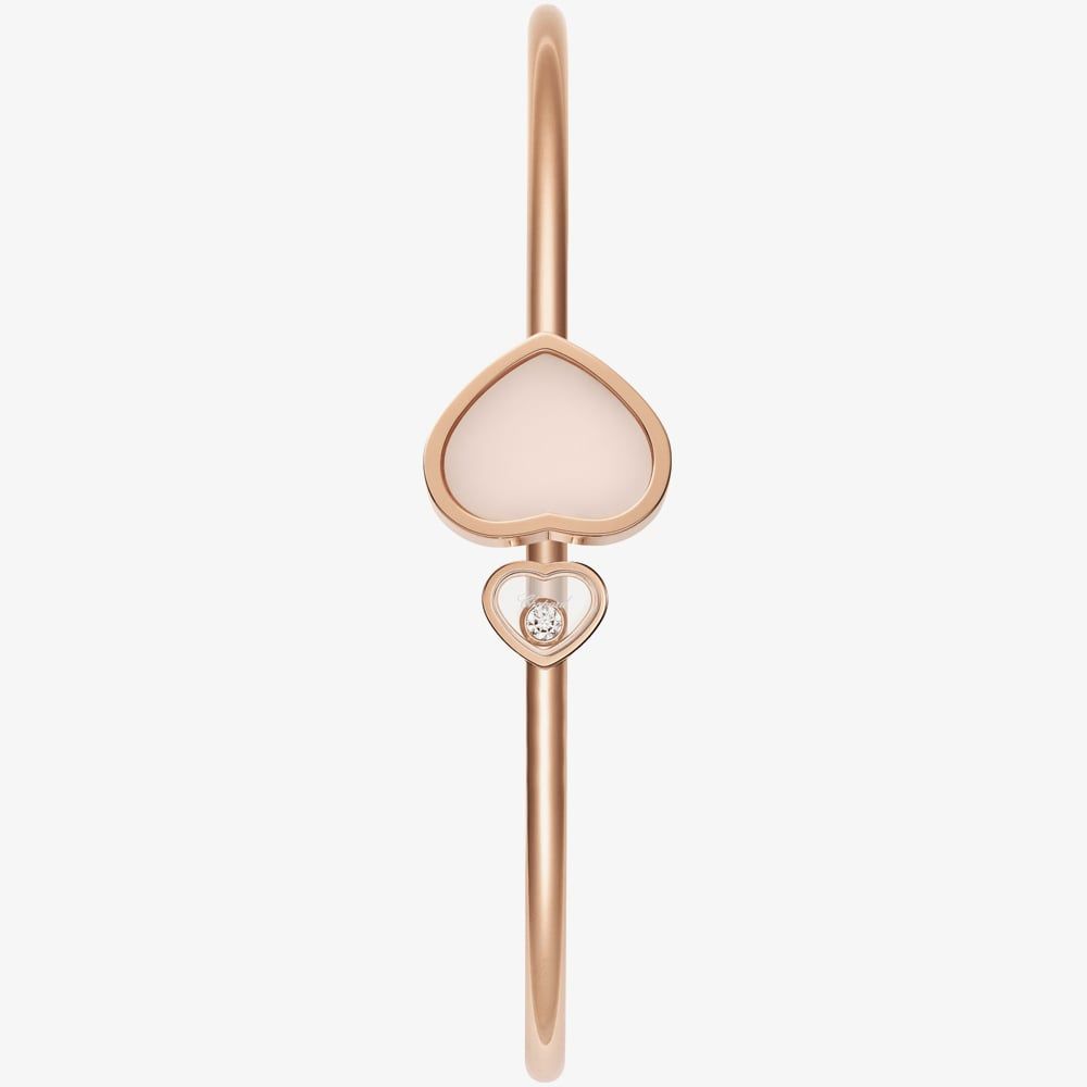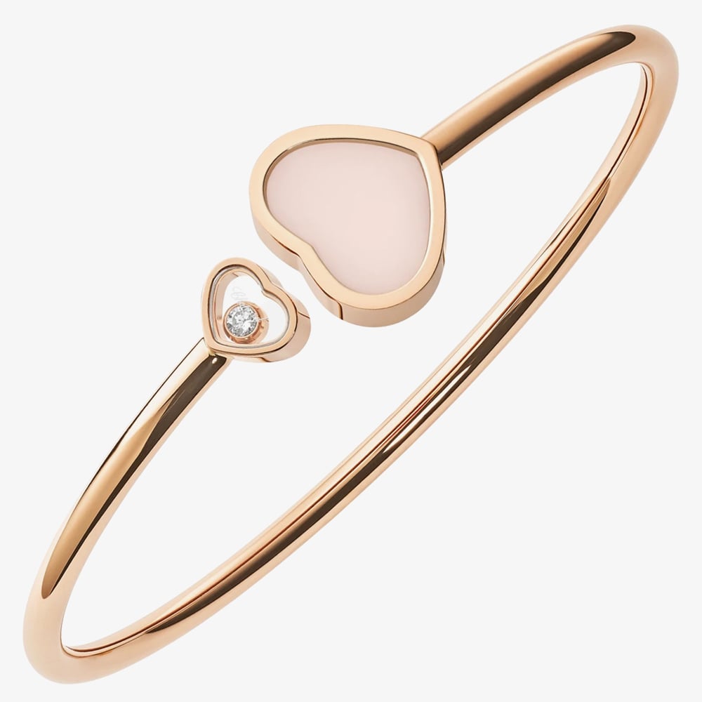 From the Happy Hearts collection, this stunning bangle crafted in 18ct rose gold and features two polished heart-shaped motifs, one filled with lustrous pink opal and the other has a free moving sparkling 0.05ct diamond set inside the crystal glass which is free to move around and dance under light. This elegant bangle is a perfect statement piece to add extra sparkle to any outfit. Little Diamonds Do Great Things.