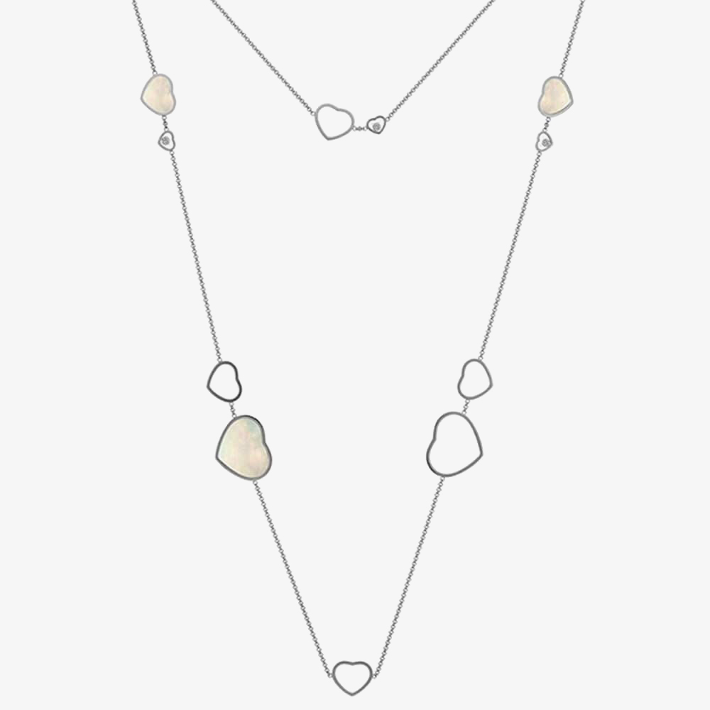 This huge double necklace design offers a 120cm chain, set with an abundance of heart-shaped designs, some hollow and others containing mother of pearl. Two of the smaller hearts each feature a solitaire diamond stone which moves freely between the sapphire crystal.