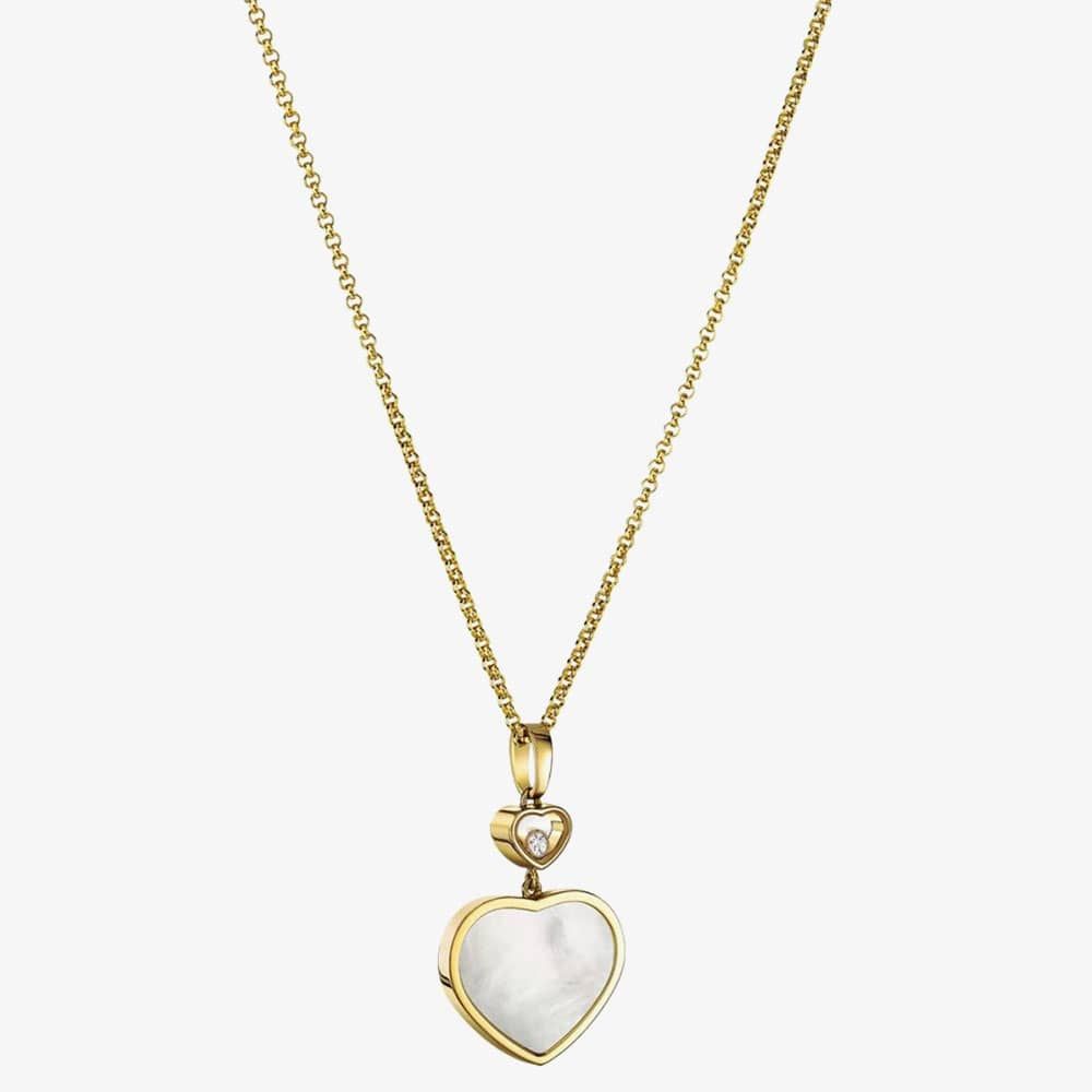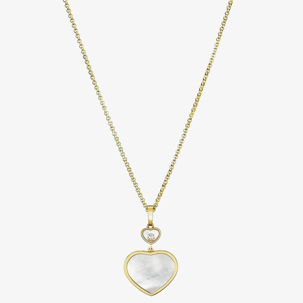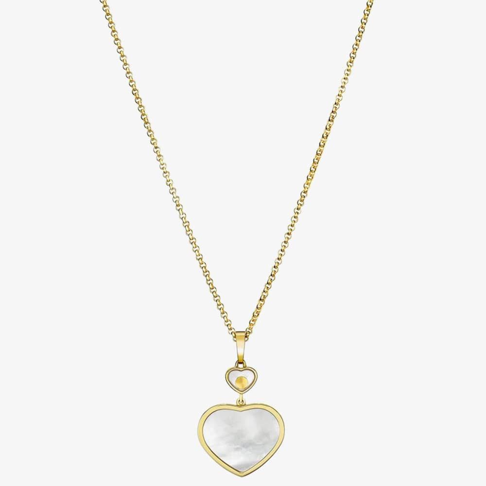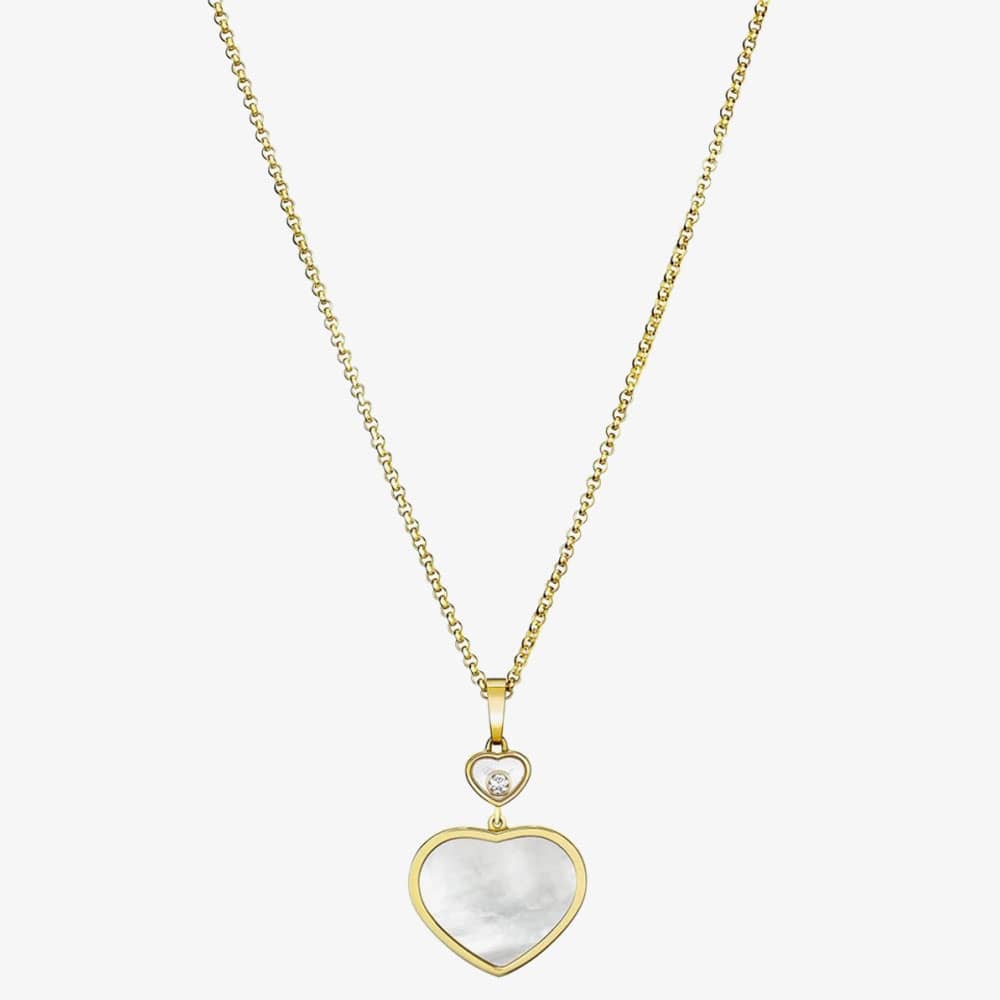 This stunning necklace is crafted with two suspended hearts, the first encasing a floating diamond and the second constructed in mother-of-pearl.