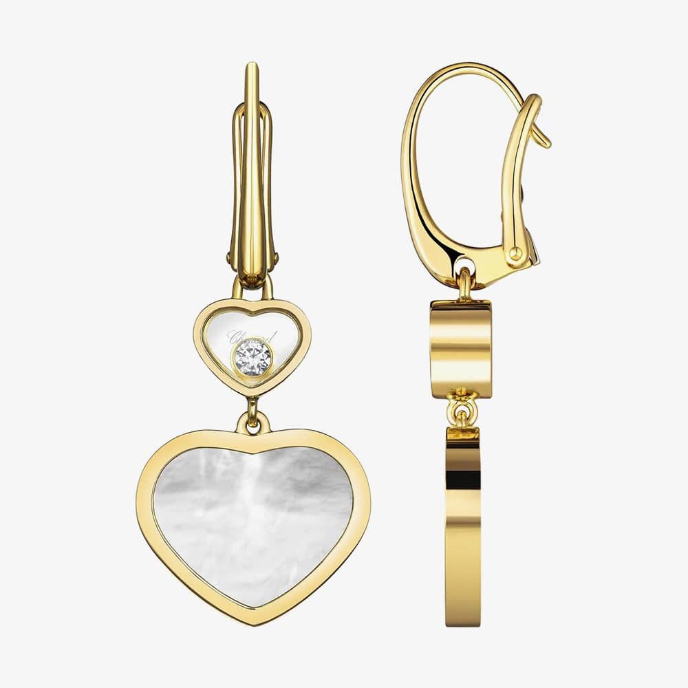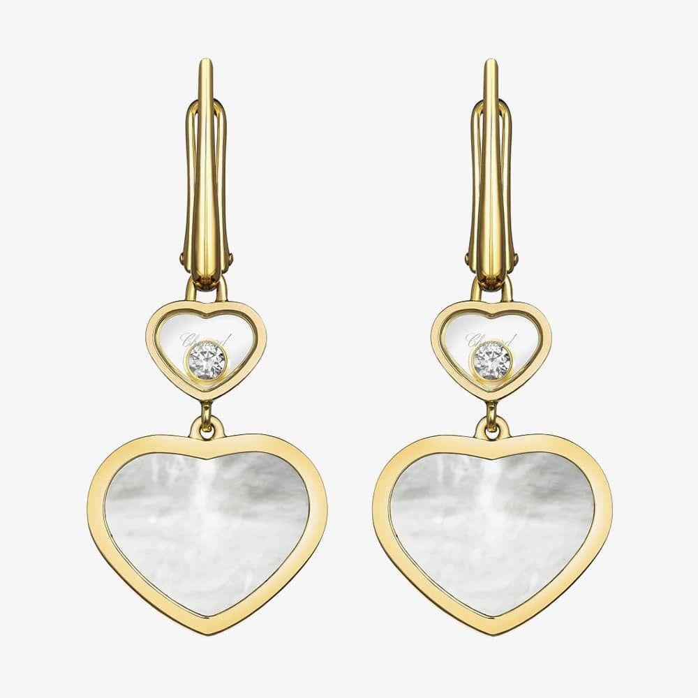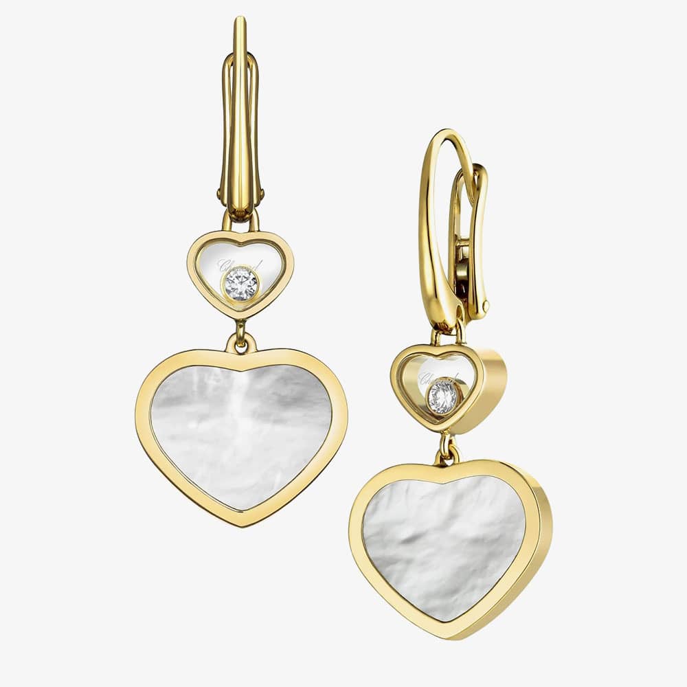 The beautiful dropper earrings are crafted with two suspended hearts, the first encasing a floating diamond and the second constructed in mother-of-pearl.