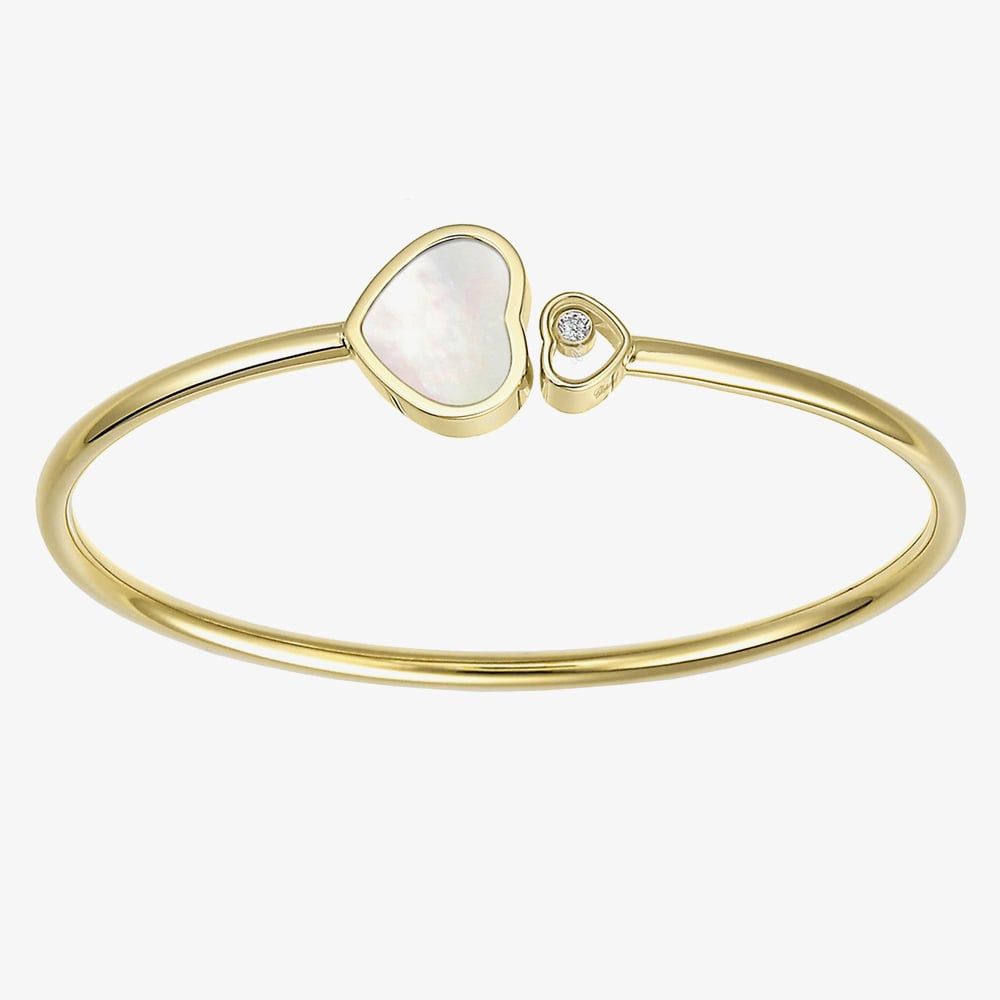 The Chopard Happy Hearts bangle in 18ct yellow gold features a luminous white mother-of-pearl heart alongside a sparkling 0.05-carat diamond, elegantly set in Chopard’s signature playful design. The warm yellow gold beautifully complements the soft sheen of the mother-of-pearl, creating a timeless and graceful accessory.