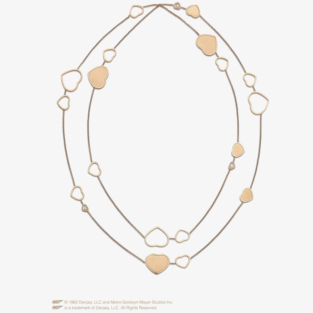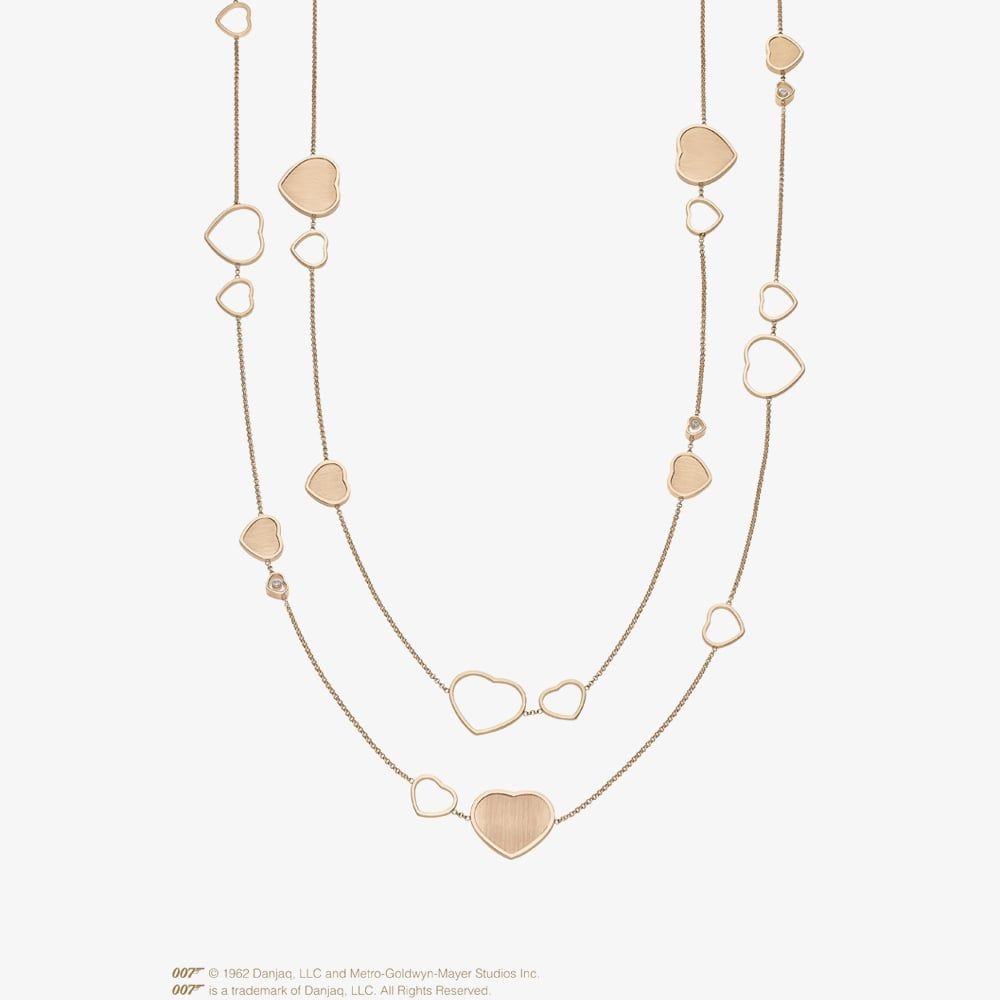From the Happy Hearts collection, this stunning Golden Hearts necklace crafted in 18ct rose gold. The Co-President & artistic director Caroline Scheufele shares her vision of the James Bond Woman: a determined & courageous woman. Limited to 7007 pieces, this two row necklace features heart-shaped open & ethically filled rose gold pendants with three heart-shaped pendants and beneath a is a free moving sparkling 0.15ct