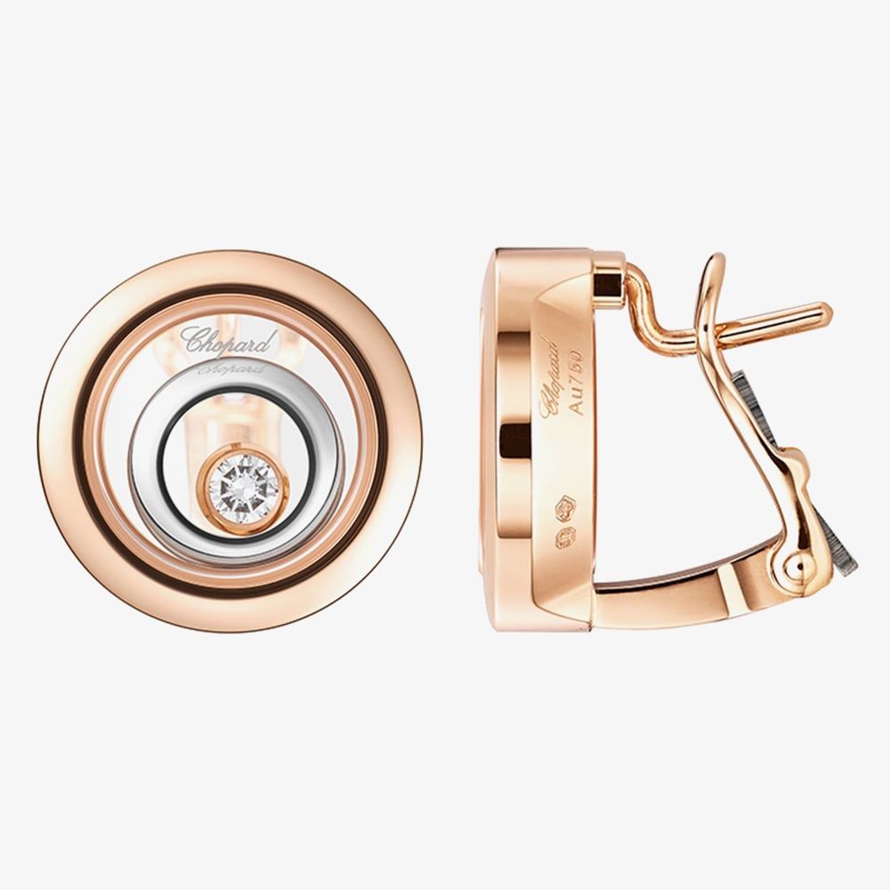 From the Happy Spirit collection, these stunning earrings crafted in 18ct rose gold and features a two colour open circle deign and has a free moving sparkling diamonds set inside the crystal glass which are free to move around and dance under light. These earrings are beautifully finished with a stud back fastening. Little Diamonds Do Great Things.