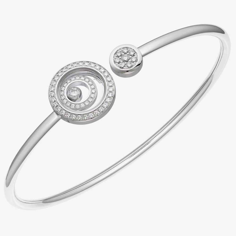 From the Happy Spirit collection, this stunning bangle crafted in 18ct white gold and features two polished circle designs, one filled with a white gold diamond set open circle design with a free moving sparkling 0.05ct diamond set inside the crystal glass which is free to move around and dance under light and the other has glistening diamond pave set design.This elegant bangle is a perfect statement piece to add extra sparkle to any outfit. Little Diamonds Do Great Things.