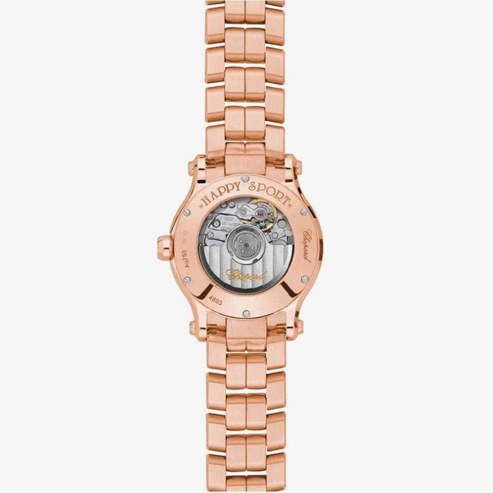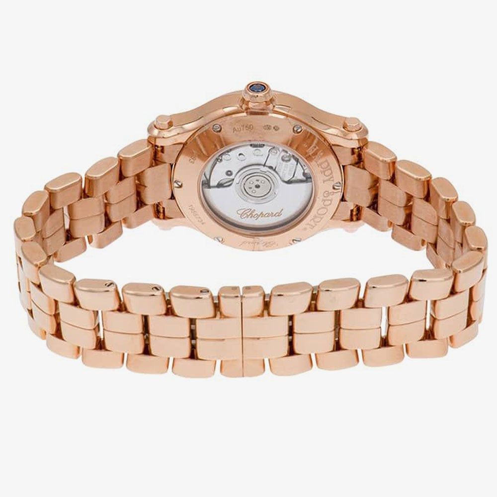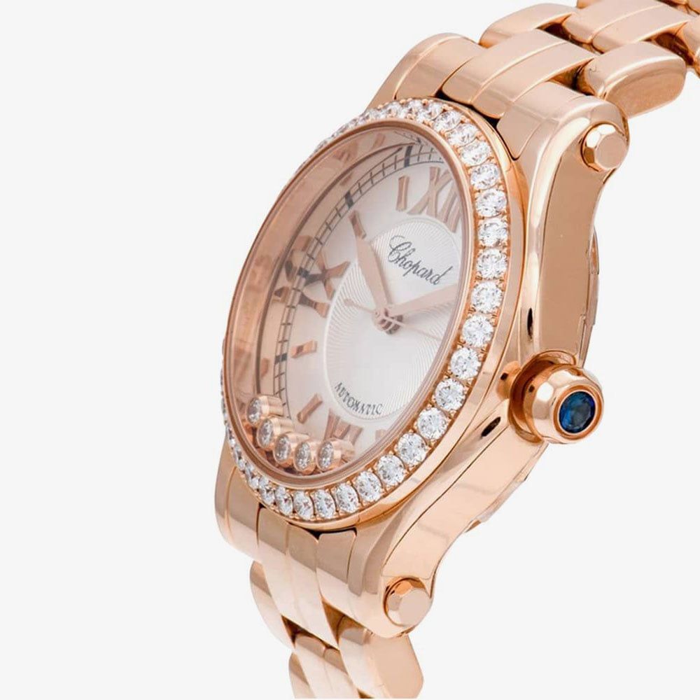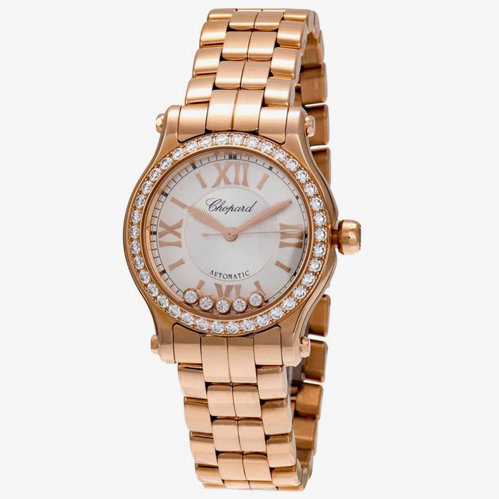 Giving you the best of femininity and classic style in one luxury watch, the Happy Sport 18ct Rose-Gold Diamond Bracelet Watch offers style and statement for every occasion big or small. Situated on a 18ct rose-gold plated stainless steel bracelet with a fold-over clasp, the white dial with a silver guilloche centre features a Chopard logo detail, 18ct rose-gold three-hand display, 18ct rose-gold roman numeral indexes, and 5 genuine diamonds - totalling 0.14 carats - set beneath the glass. Encased in an 18ct rose-gold plated stainless steel 30mm dial case embezzled with diamonds and fitted with glareproof scratch-resistant sapphire glass and a blue diamond on the crown of the watch, the watch operates on Swiss-made self-winding movement and is water resistant to 30m, making it a must have.