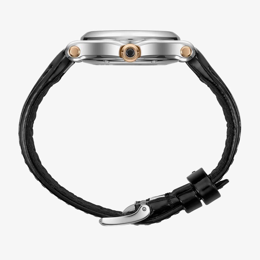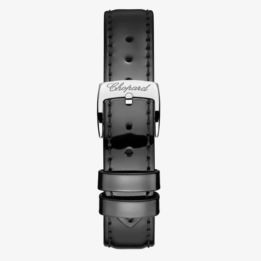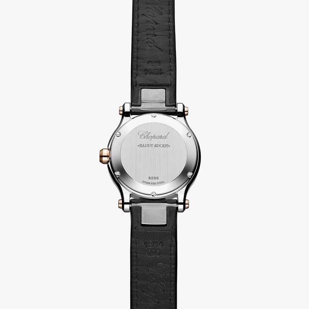 The Happy Sport collection embodies Chopard’s creativity and daring spirit. Since 1993, it has captivated imaginations with its playful, free-spinning gems, dancing between two sapphire crystals. Chopard made history as the first Maison to combine steel and diamonds, proving that even little diamonds can do great things. This watch features stainless steel, black calfskin leather, and 18ct rose gold accents, with a total carat weight of 0.08ct.