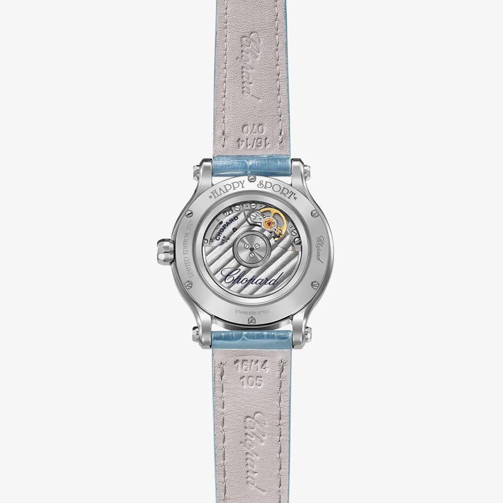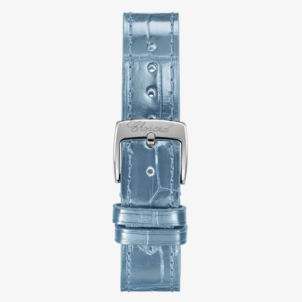 The Happy Sport collection epitomizes Chopard’s creativity and daring. Since 1993, its playful, free-spinning gems, dancing between two sapphire crystals, have captured imaginations. This stainless steel watch features a light blue calfskin leather strap and a total diamond carat weight of 1.39ct. This watch is limited edition to 250 pieces.