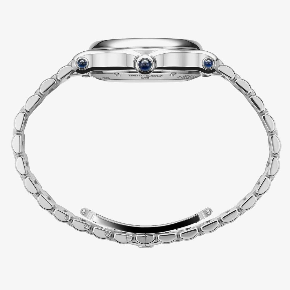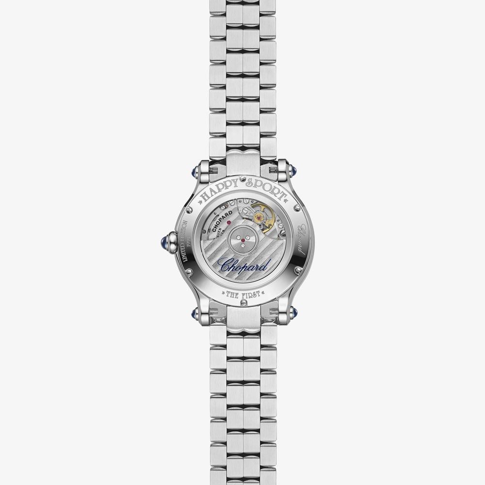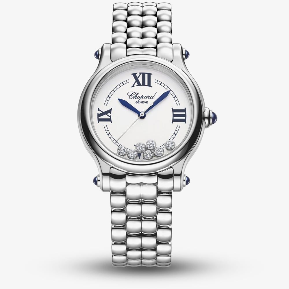 Giving you the best of classic style in one luxury watch, the Happy Sport Geneve Silver Diamond Watch offers style and statement for every occasion big or small. Situated on a stainless steel 4-link bracelet with a fold-over clasp, the white dial features a Chopard logo detail, navy and silver three-hand display, navy roman numeral indexes, and 7 genuine diamonds set beneath the glass. Encased in a 33mm dial case with glareproof scratch-resistant sapphire glass and featuring a blue diamond on the crown of the watch, the watch operates on Swiss-Made self-winding movement and is water resistant to 30m, making it a must have.
