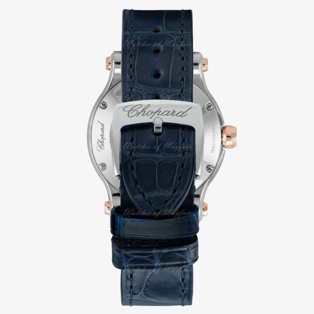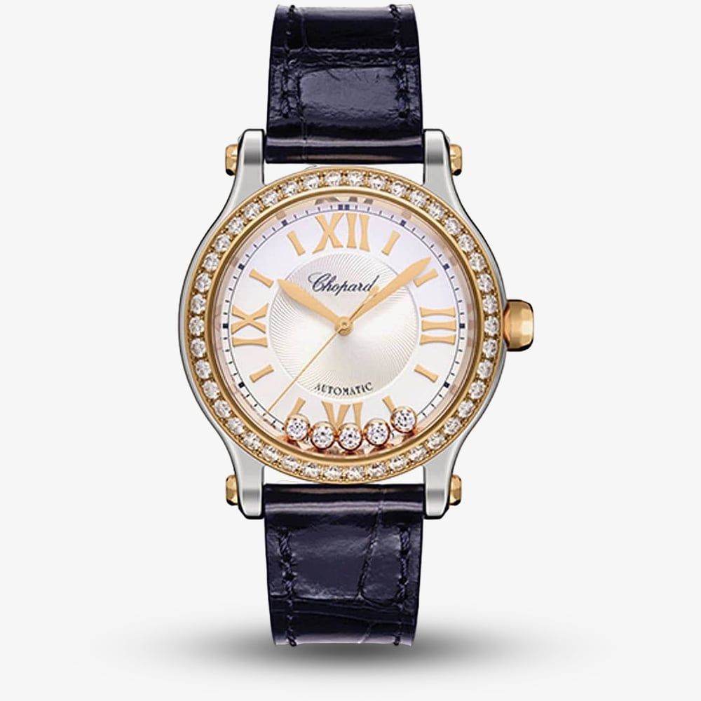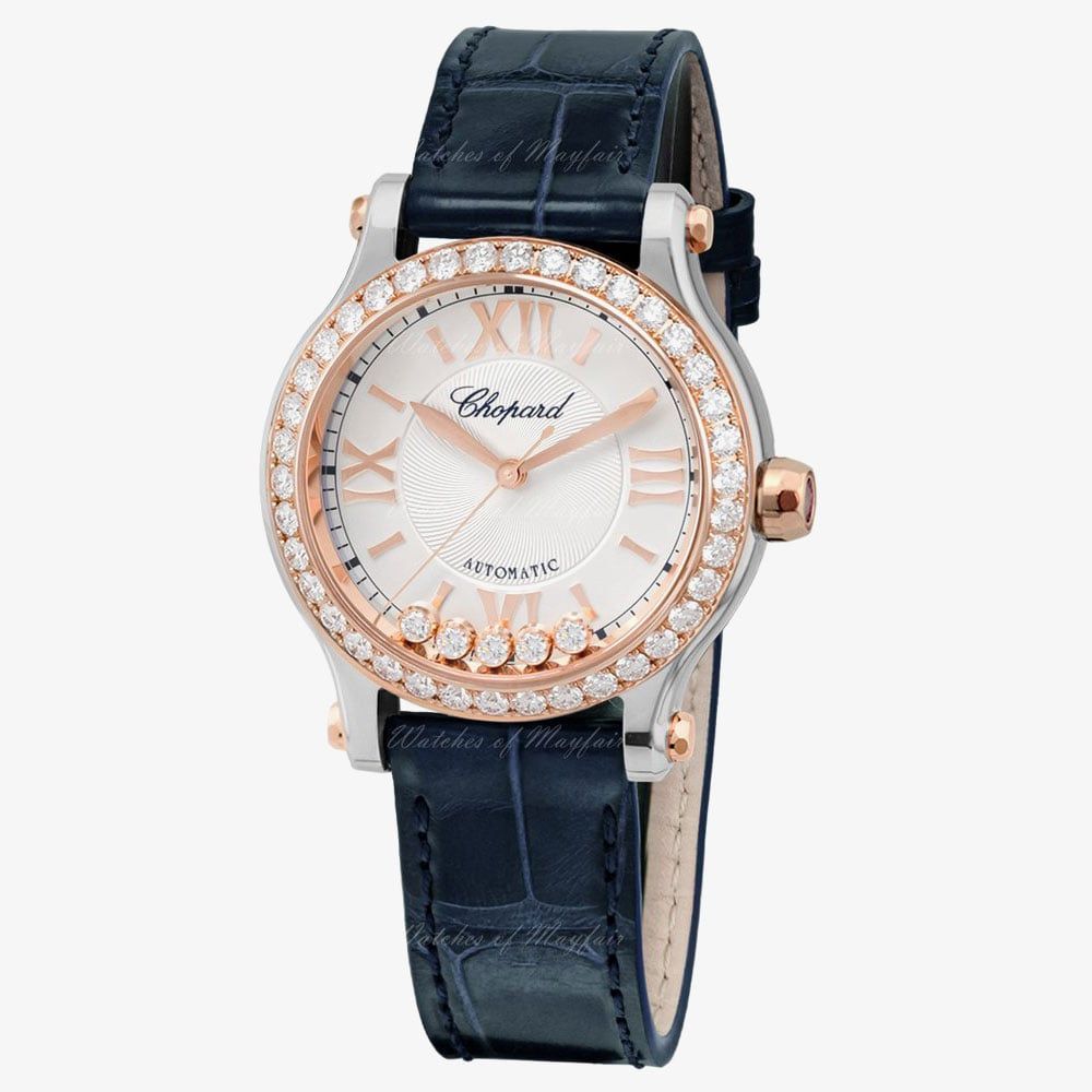 Giving you the best of classic style and subtle opulence in one luxury watch, the Chopard Happy Sport Stainless Steel and 18ct Rose Gold Diamond Watch offers style and statement for every occasion big or small. Situated on a textured alligator black leather strap with a traditional buckle, the white dial with a silver guilloche centre features a Chopard logo detail, 18ct rose gold three-hand display, 18ct rose gold roman numeral indexes, 5 genuine diamonds totalling 0.14 carats set beneath the glass, and a diamond embezzeled dial edge. Encased in a stainless steel 33mm dial case with glareproof scratch-resistant sapphire glass and a diamond on the crown of the watch, the watch operates on Swiss-made self-winding movement and is water resistant to 30m, making it a must have.