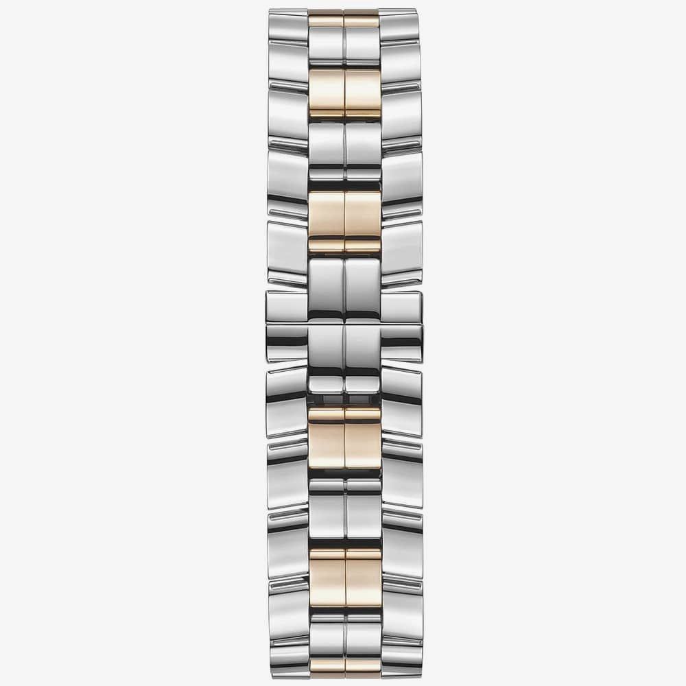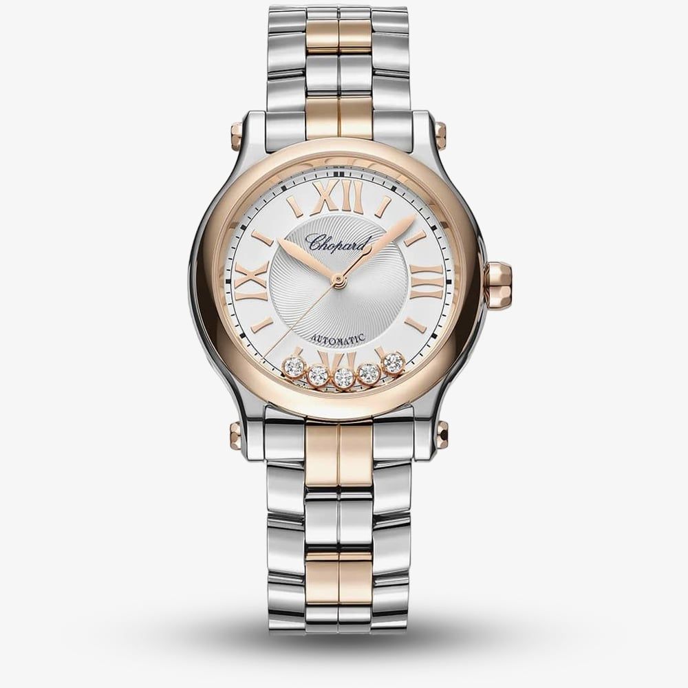 Giving you the best of classic style and luxury in one watch, the Happy Sport Two Tone Bracelet Watch offers style and statement for every occasion big or small. Situated on a two tone stainless steel and 18ct rose-gold 4-link bracelet with a fold-over clasp, the white dial with a guilloche centre features a Chopard logo detail, 18ct rose-gold three-hand display, 18ct rose-gold roman numeral and baton indexes, and 5 genuine diamonds set beneath the glass. Encased in a stainless steel and 18ct rose-gold 33mm dial case with glareproof scratch-resistant sapphire glass and featuring a coloured diamond on the crown of the watch, the watch operates on self-winding movement and is water resistant to 30m, making it a must have.