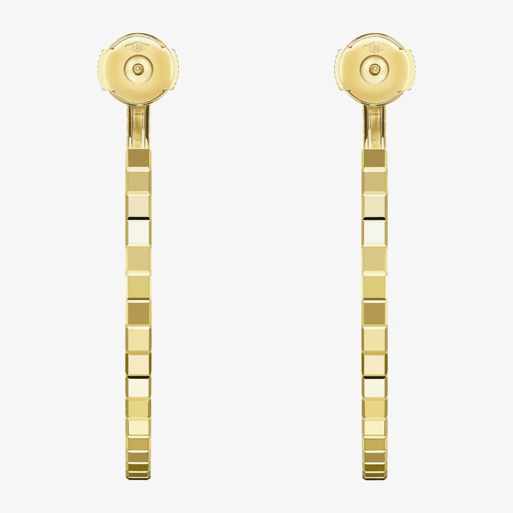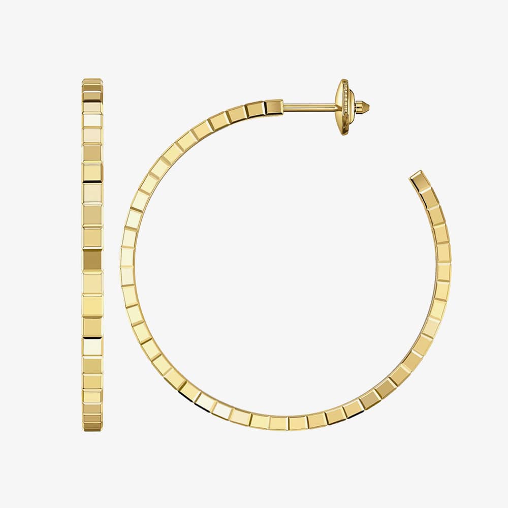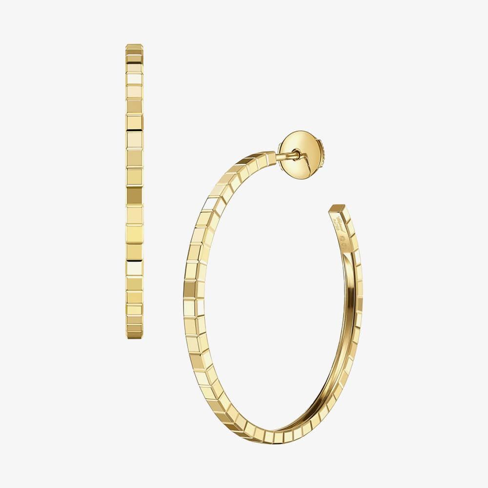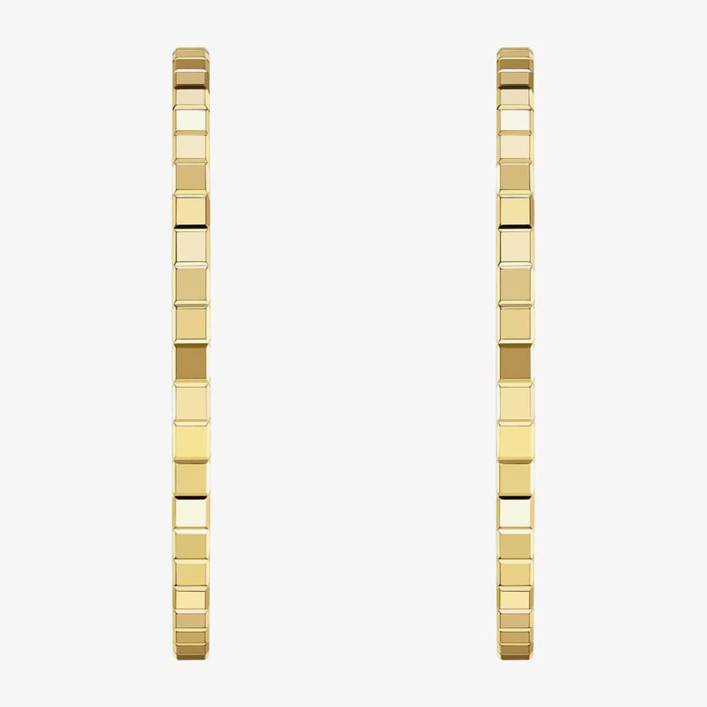 These large half hoop earrings crafted from 18ct yellow gold feature a stylish ice cube box design across their surface. These earrings combine classic elegance with a modern twist, adding a touch of sophistication to any outfit.
