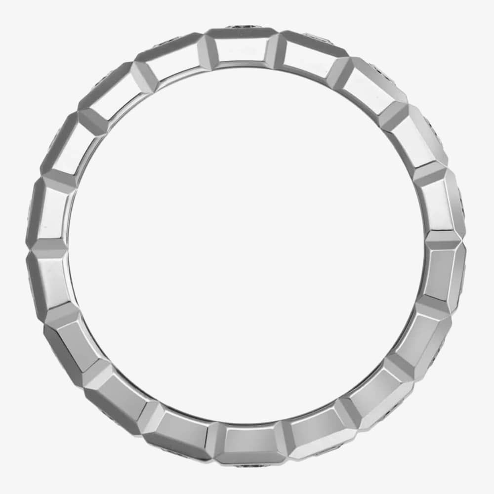 Chopard Ice Cube 18ct White Gold Wide Half Eternity Cube Ring 829834-1039 53 is delicately crafted from 18-carat white gold adorned with eleven white diamonds with an weight of 0.38ct. This beautiful ring offers successive interpretations of a modern aesthetic inspired by tiny blocks of ice. The cube is a source of inspiration in all creative fields, featuring perfectly shaped cubes with half of the ring adorned with diamond-set cubes. This delicate ring comes in size 53.