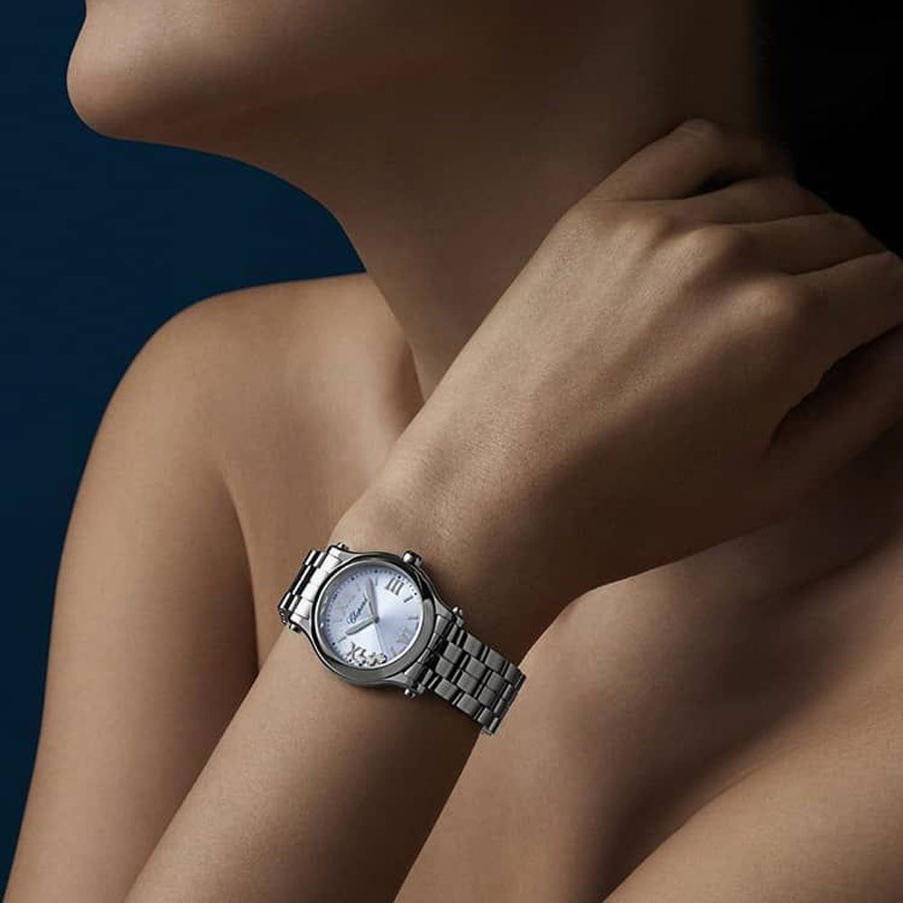 Watches and Wonders The Chopard Ladies Happy Sport Blue Dial Watch 278590-3010 watch combines a 30mm round shaped stainless steel case and silver stainless steel bracelet with a fold over clasp. It has a blue analogue dial which is protected beneath scratch resistant sapphire crystal glass. Power is generated by the quartz movement. Watch Also feautres 3 free moving 0.08 carat white diamonds in the dial of the watch.Chopardhttps://www.thbaker.co.uk/media/catalog/product/2/4/24-47-038_02_1.jpghttps://www.thbaker.co.uk/media/catalog/product/2/4/24-47-038_03_1.jpghttps://www.thbaker.co.uk/media/catalog/product/2/4/24-47-038_model_01.jpgcondition:Nodisc_no_stock:Noex_display:Nosearch_keywords:luxuryNoNoNoluxury2447038Chopard278590-3010LadiesOfficial Chopard Packaging2 Year Chopard WarrantyLuxuryNoWatchSilverStainless Steel BraceletStainless SteelRound30mmAnalogueSapphire Crystal GlassBlue30 metresQuartzFold Over ClaspNoNoNoNoNoNoNoChopard Ladies Happy Sport Blue Dial Watch24-47-0382022-08-09 00:00:00[{"path":"\/Watches","url":"\/watches\/"},{"path":"\/Watches\/Ladies Watches","url":"\/ladies-watches\/"},{"path":"\/Watches\/Quartz Watches","url":"\/quartz-watches\/"},{"path":"\/Watches\/Sports Watches","url":"\/sports-watches\/"},{"path":"\/Watches\/Swiss Watches","url":"\/swiss-watches\/"},{"path":"\/Brands A-Z\/Chopard","url":"\/chopard\/"},{"path":"\/Brands A-Z\/Chopard\/Chopard Happy Sport","url":"\/chopard-happy-sport\/"},{"path":"\/Watches\/Luxury Watches","url":"\/luxury-watches\/"},{"path":"\/Brands A-Z\/Chopard\/Chopard Watches","url":"\/chopard-watches\/"},{"path":"\/Free Gift Card - When you spend \u00a3500+","url":"\/free-gift-card\/"},{"path":"\/Watches\/Luxury Watches\/Ladies Luxury Watches","url":"\/ladies-luxury-watches\/"}]2022-08-09