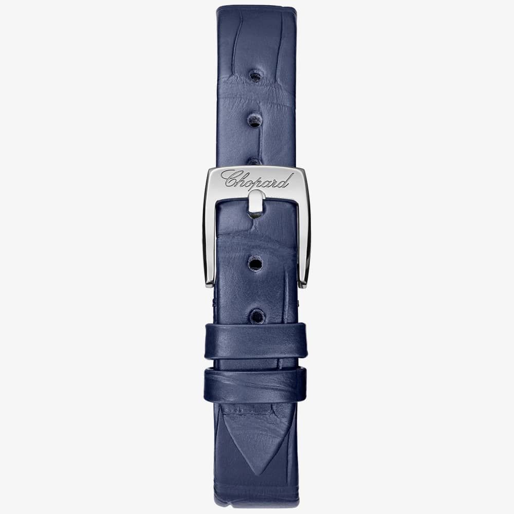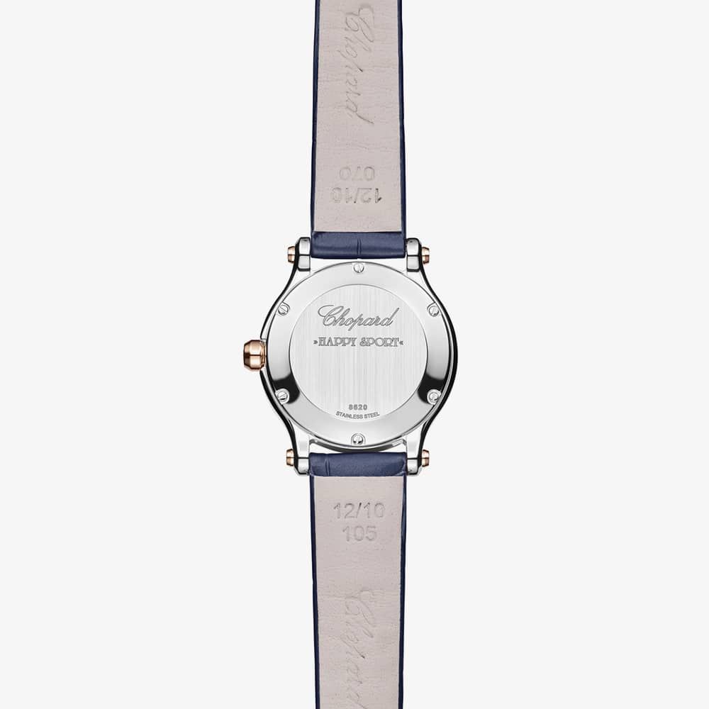 This Chopard Happy sport is a stunning piece to the Chopard collection. The watch features the signature dial floating 0.09ct white diamonds and beautiful silver dial with a blue Chopard logo. This watch also features a long calfskin leather strap, which allows you to wrap it around your wrist twice for a stand out look. This version of the watch features a 18 kt Rose gold Bezel that has 0.069ct diamonds across it.