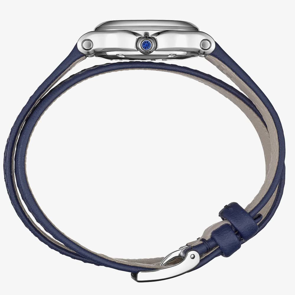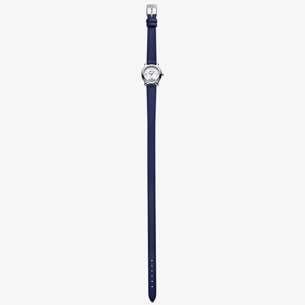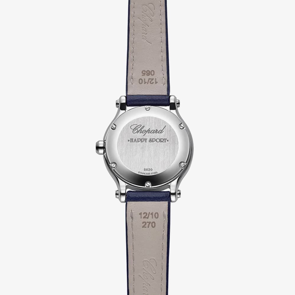 This Chopard Happy sport is a stunning piece to the Chopard collection. The watch features the signature dial floating 0.09ct white diamonds and beautiful silver dial with a blue Chopard logo. This watch also features a long calfskin leather strap, which allows you to wrap it around your wrist twice for a stand out look.