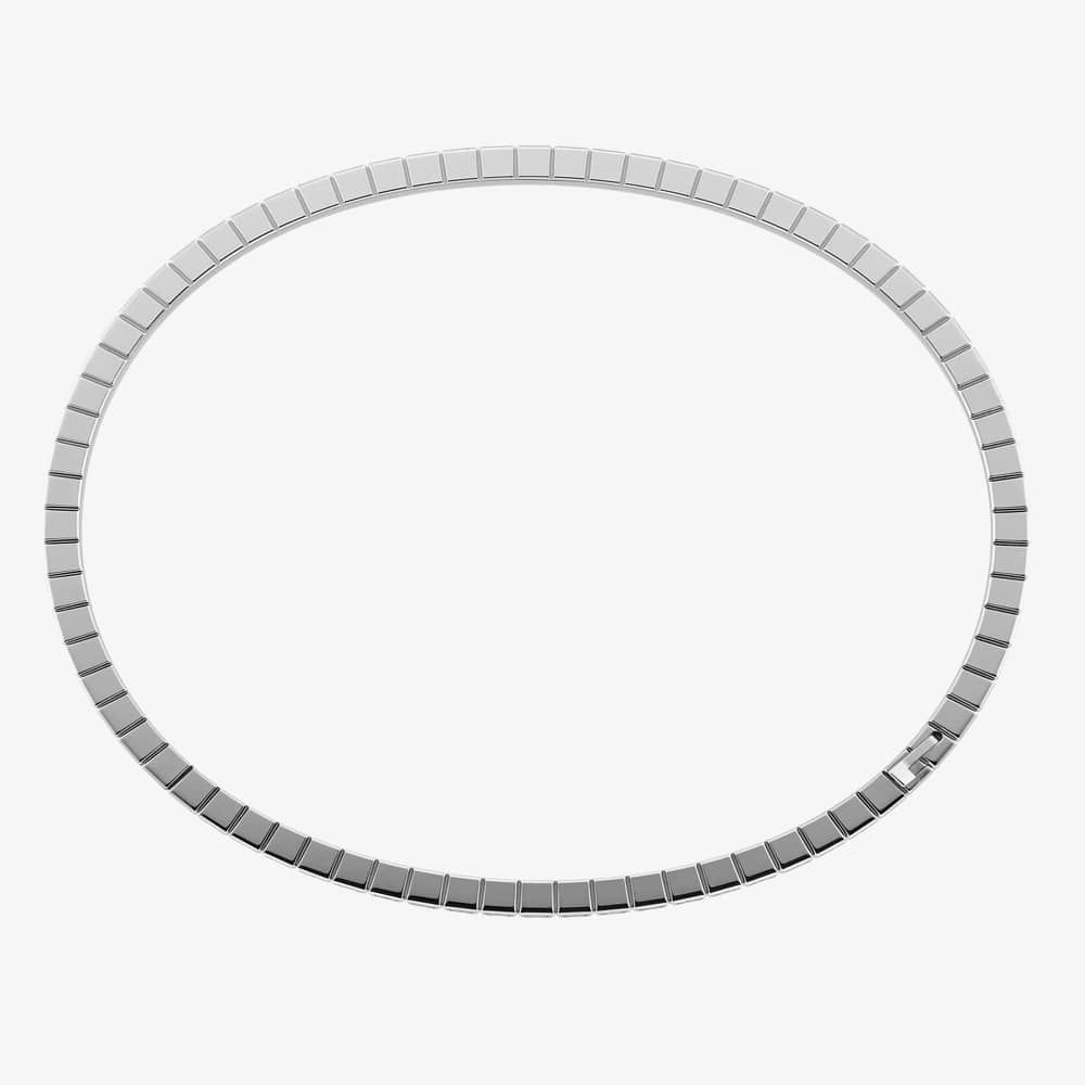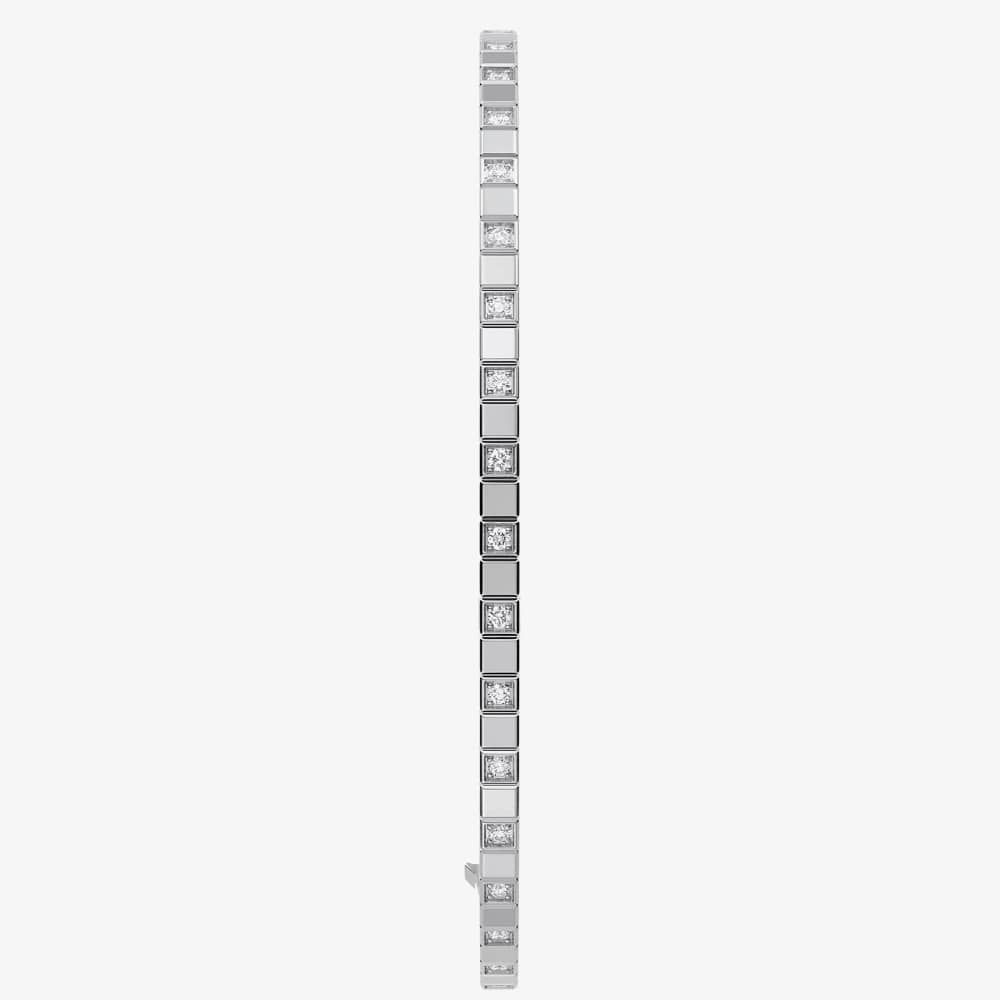 Chopard Ice Cube 18ct White Gold Half Set Diamond Cube Bangle 857702-1009 SML is delicately crafted from 18-carat white gold adorned with 17 white diamonds with a weight of 0.33ct. This beautiful bangle offers successive interpretations of a modern aesthetic inspired by tiny ice blocks. The cube is a source of inspiration in all creative fields, featuring alternating half-set diamond-set cubes with a hinged mechanism for secure fastening.