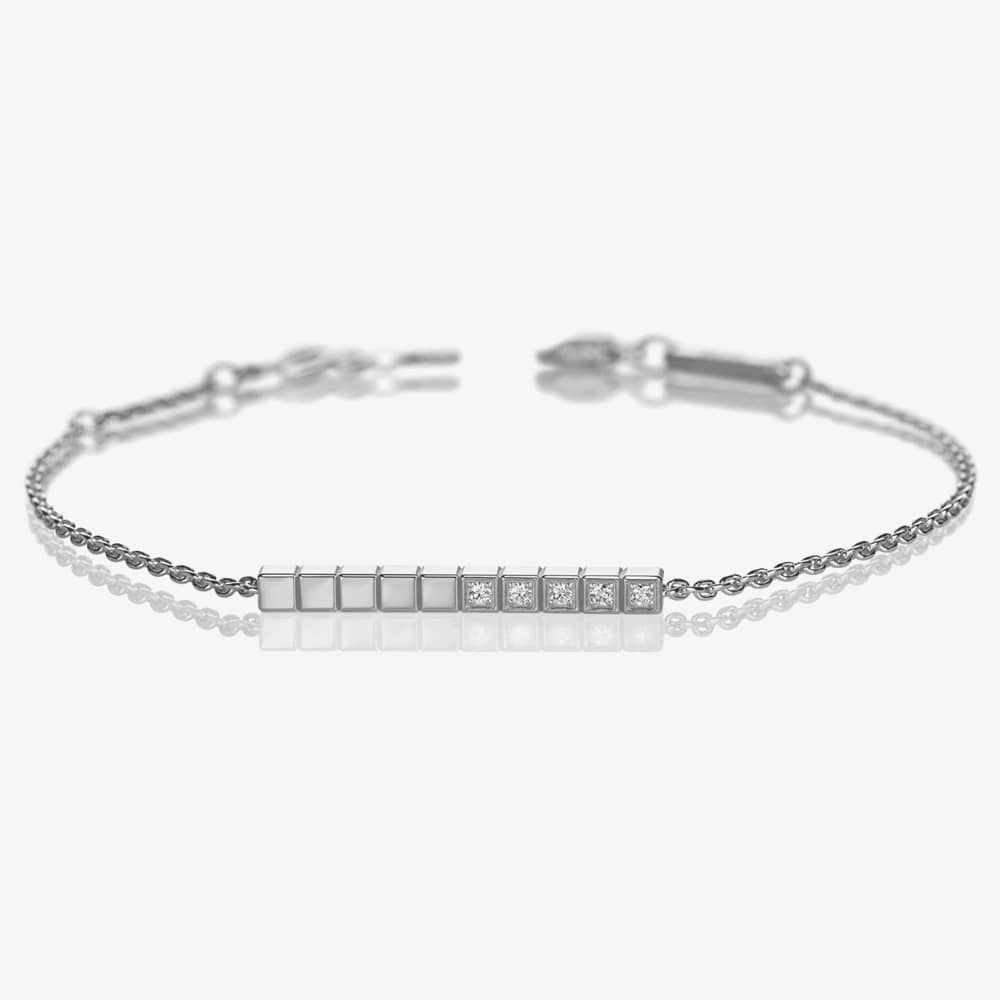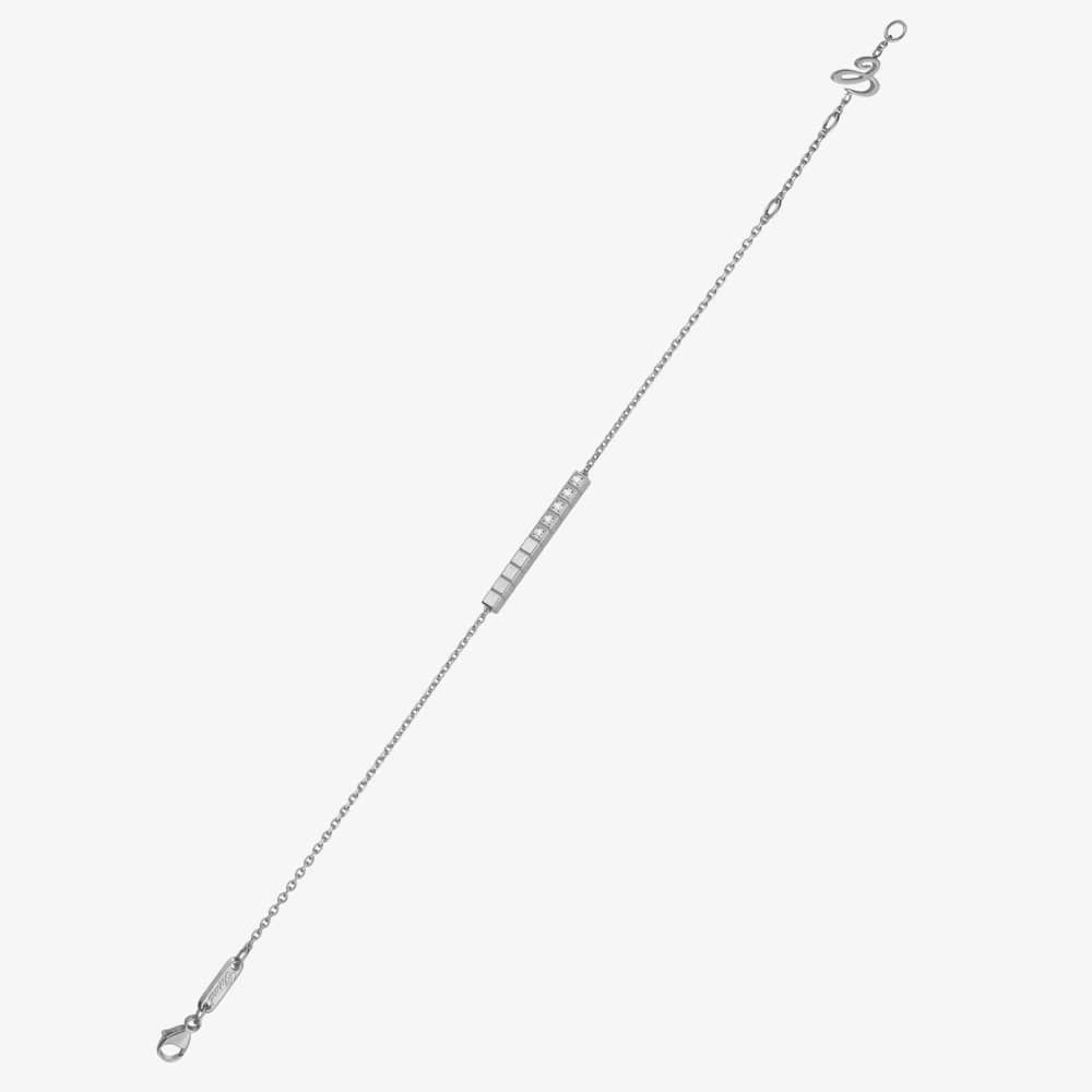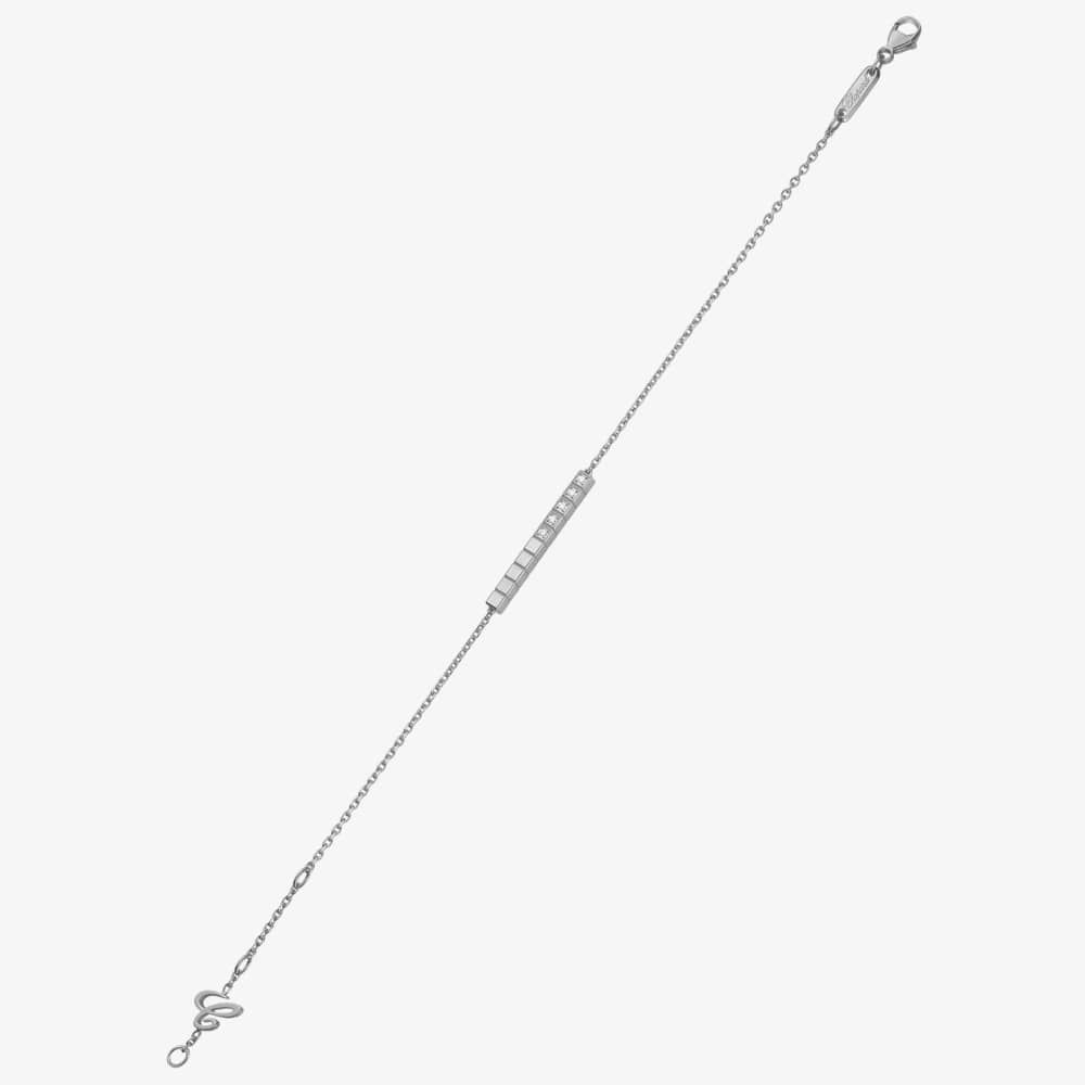 Chopard Ice Cube 18ct White Gold Half Set Diamond Cube Bracelet 857702-1002 is delicately crafted from 18-carat white gold adorned with five white diamonds with an weight of 0.10ct. This beautiful bracelet offers successive interpretations of a modern aesthetic inspired by tiny blocks of ice. The cube is a source of inspiration in all creative fields, featuring ten perfectly shaped cubes with five diamond-set cubes suspended on an adjustable 18-carat white gold belcher chain with a lobster claw clasp for a secure fastening. Weight of gold: 4.40g. Bracelet adjustable length: 16, 17.5cm or 19cm.