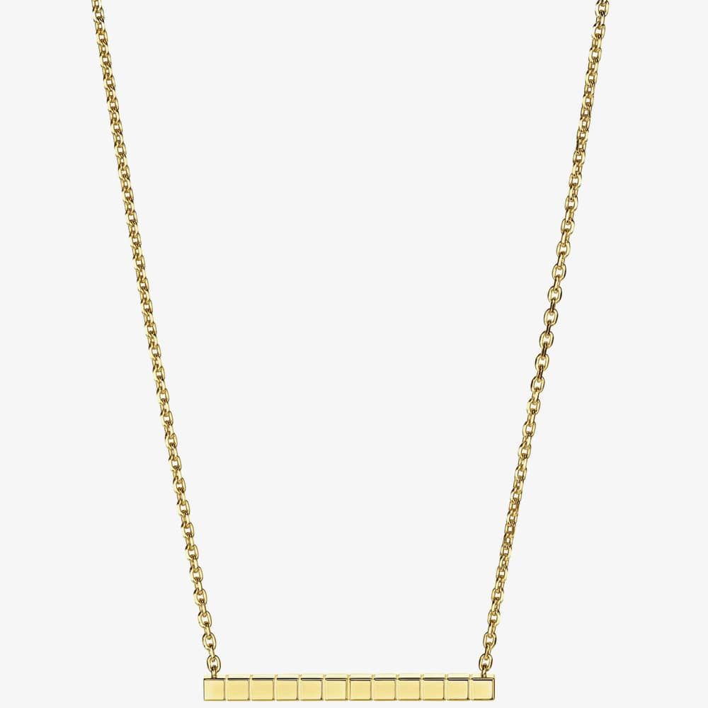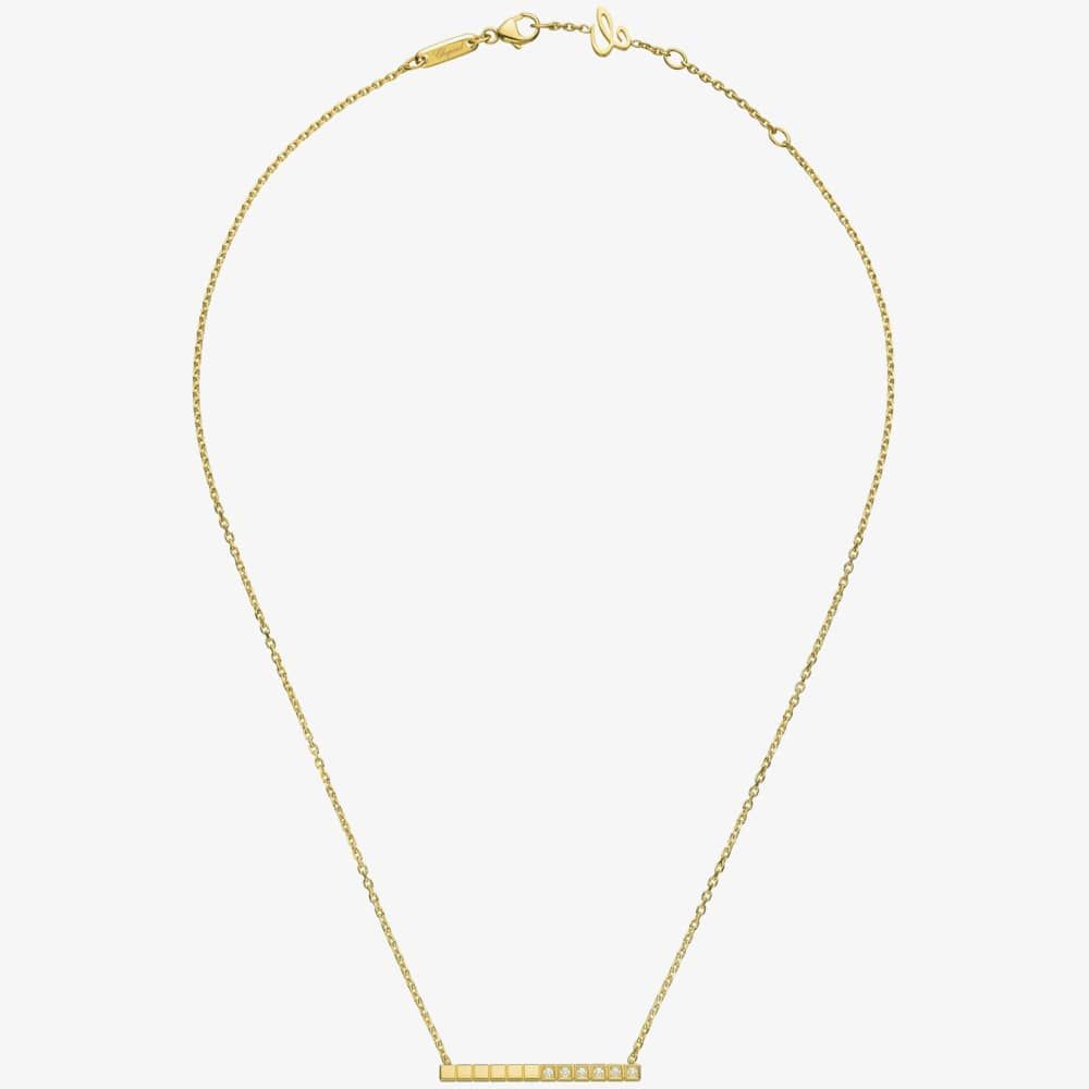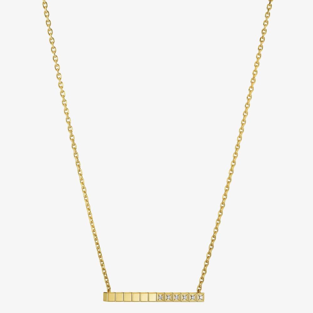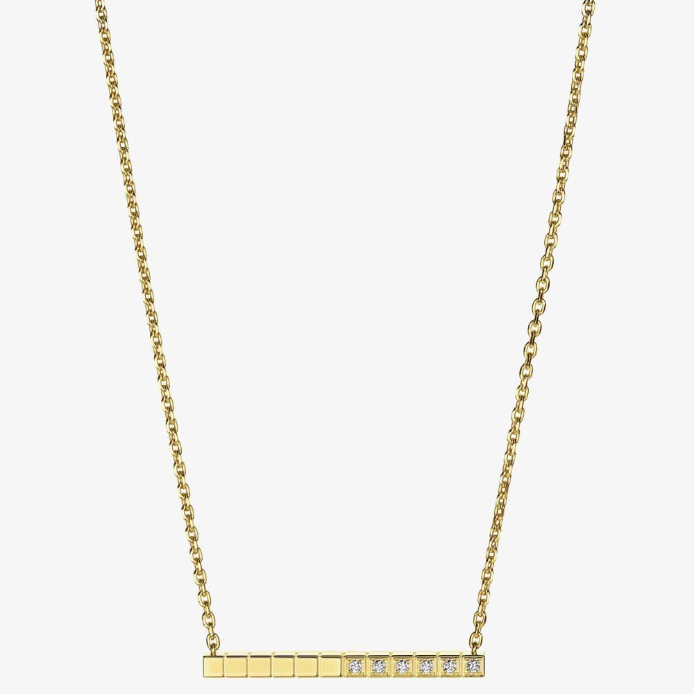 Chopard Ice Cube 18ct Yellow Gold Half Set Diamond Cube Bar Necklace 817702-0002 is delicately crafted from 18-carat yellow gold adorned with six white diamonds with an weight of 0.06ct. This beautiful necklace offers successive interpretations of a modern aesthetic inspired by tiny blocks of ice. The cube is a source of inspiration in all creative fields, featuring twelve perfectly shaped cubes with six diamond-set cubes suspended on an adjustable 18-carat yellow gold belcher chain with a lobster claw clasp for a secure fastening. Chain length: 42cm. Weight of gold: 6.50g.