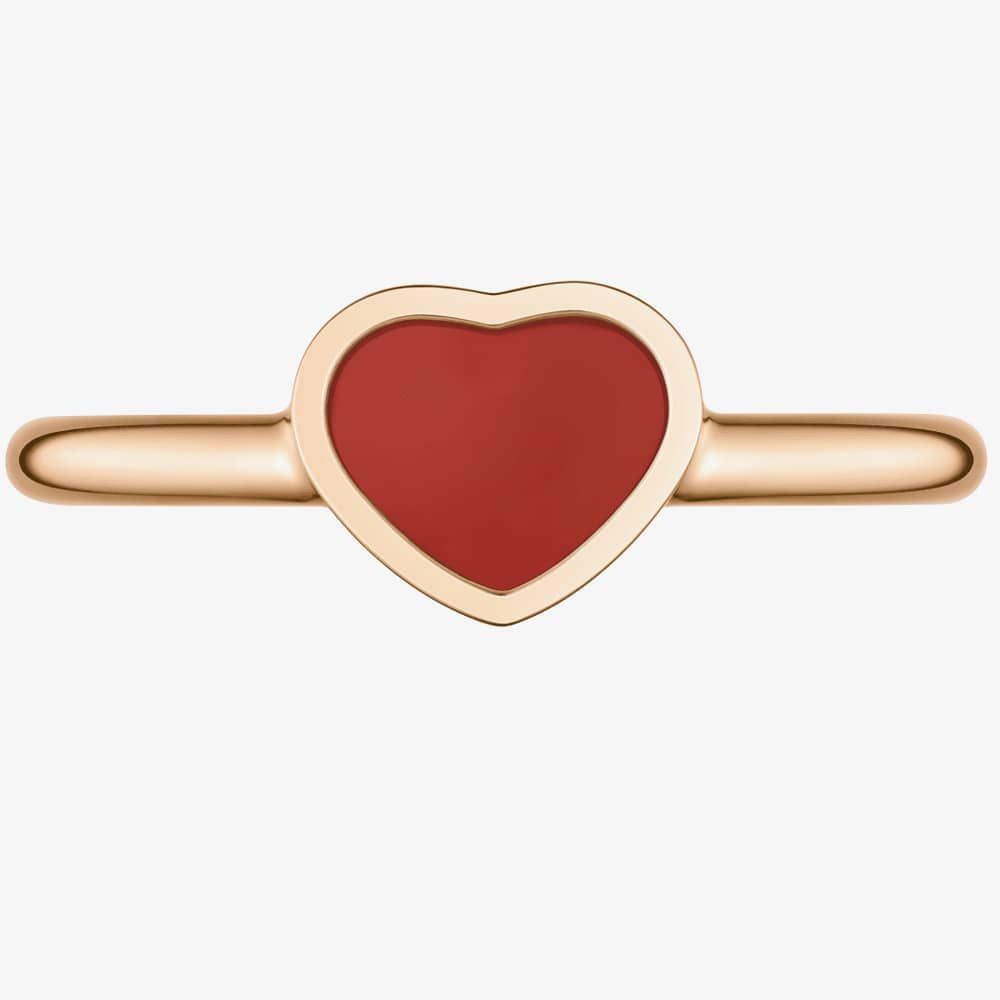 The Chopard My Happy Hearts Carnelian Ring 82A086-5808 5802 is expertly crafted from ethical 18ct rose gold, with a heart motif featuring a red Carnelian inlay, forming a delicate constellation. This beautiful ring can be worn alone or stacked as stylish accessories. Me, Myself and My Happy Hearts.