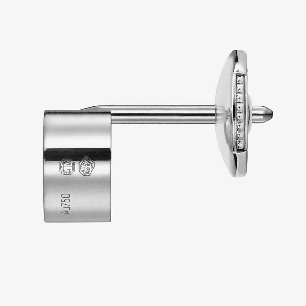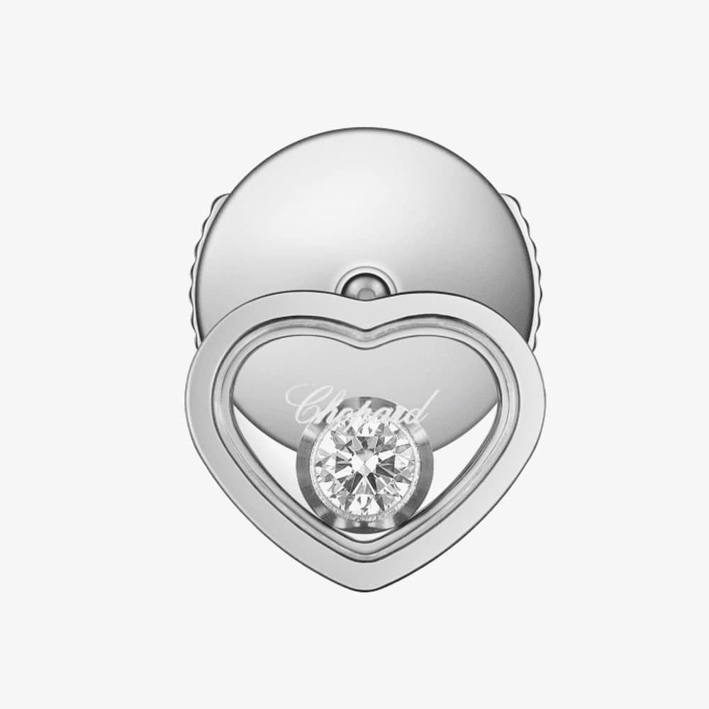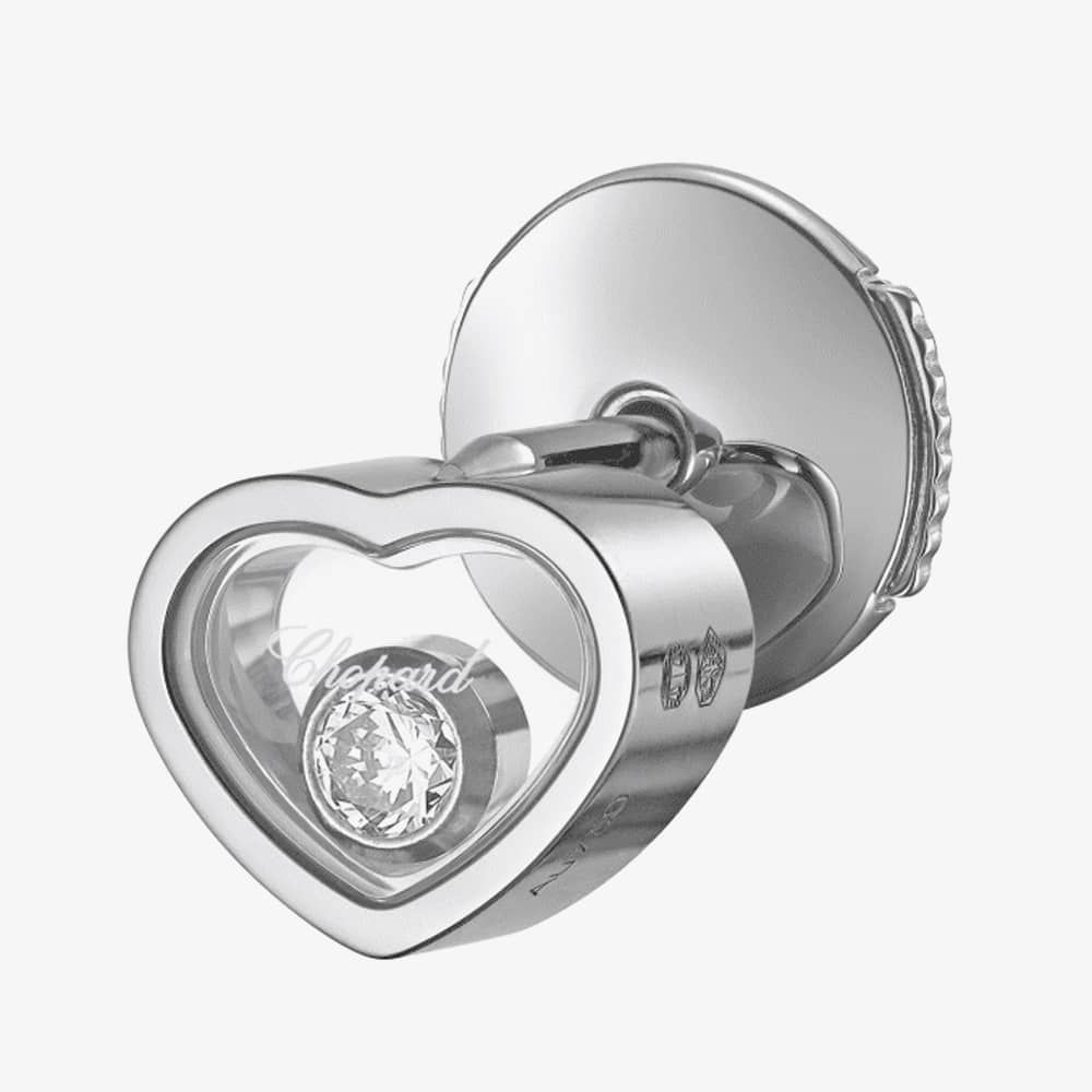 The Chopard My Happy Hearts 1 Diamond Single Earring 83A086-1092 is expertly crafted from ethical 18ct white gold, with a clear hollow heart motif, featuring a singular white diamond with an weight of 0.05ct, forming a delicate constellation. This beautiful heart motif adorns an 18ct white-gold singular stud with a la pousette earring backing for a secure fitting. This stud can be worn alone or stacked as stylish accessories. Me, Myself and My Happy Hearts.