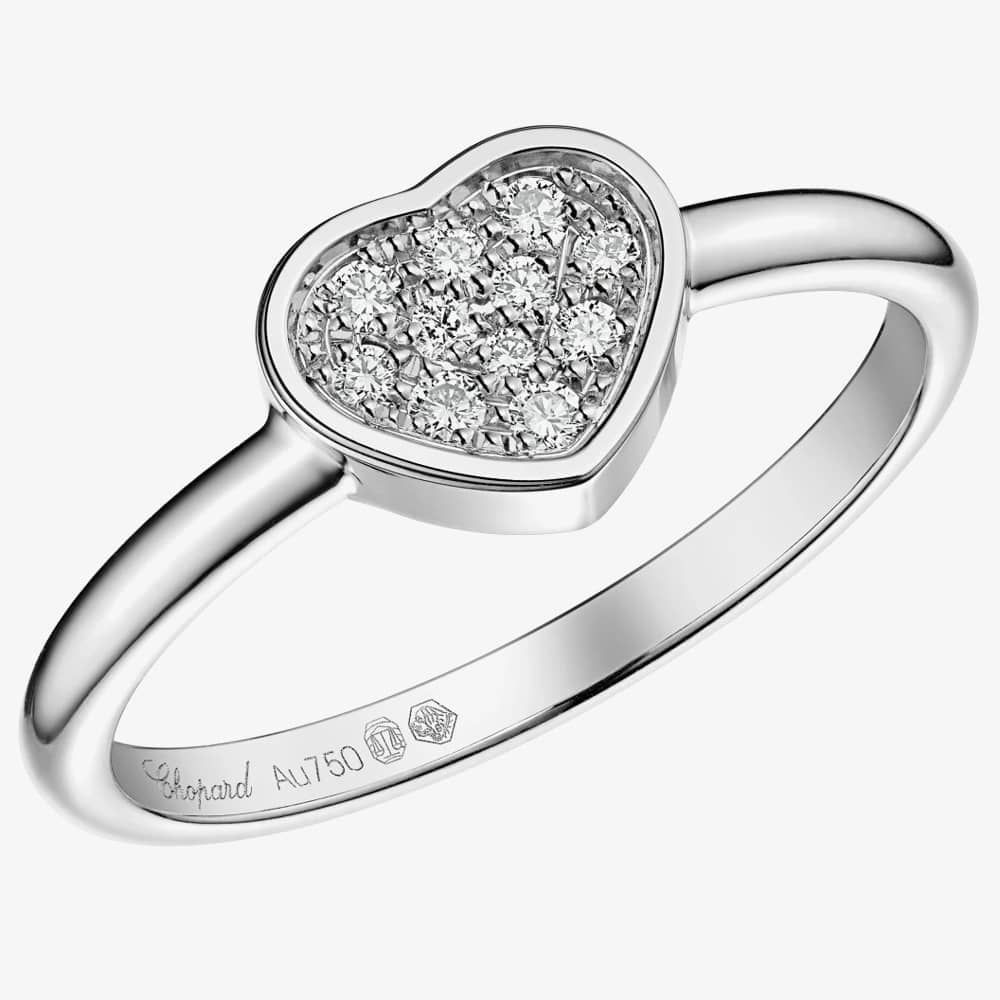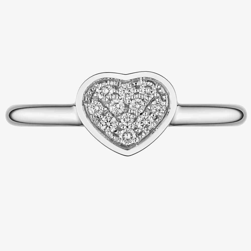 The Chopard My Happy Hearts 18ct White Gold Diamond Ring 82A086-1908 is expertly crafted from ethical 18ct white gold, with a heart motif featuring eleven white diamonds weighing an weight of 0.11ct. This beautiful ring can be worn alone or stacked as stylish accessories. Me, Myself and My Happy Hearts.