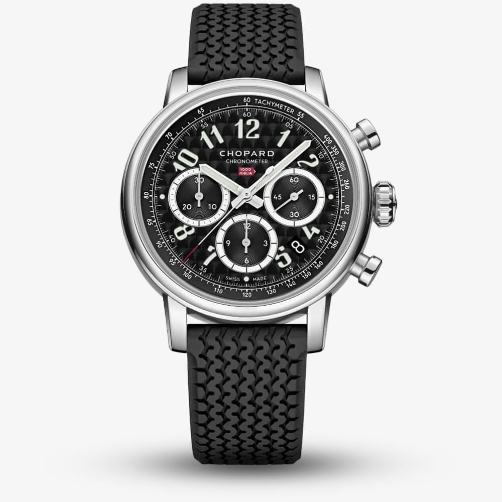 The Chopard Mille Miglia is a stunning and stand out timepiece that looks race ready. This watch features a chronometer certified movement for guaranteed time keeping accuracy, a tachymeter timing scale bezel and three chronograph sub dials. The watch also features a date display