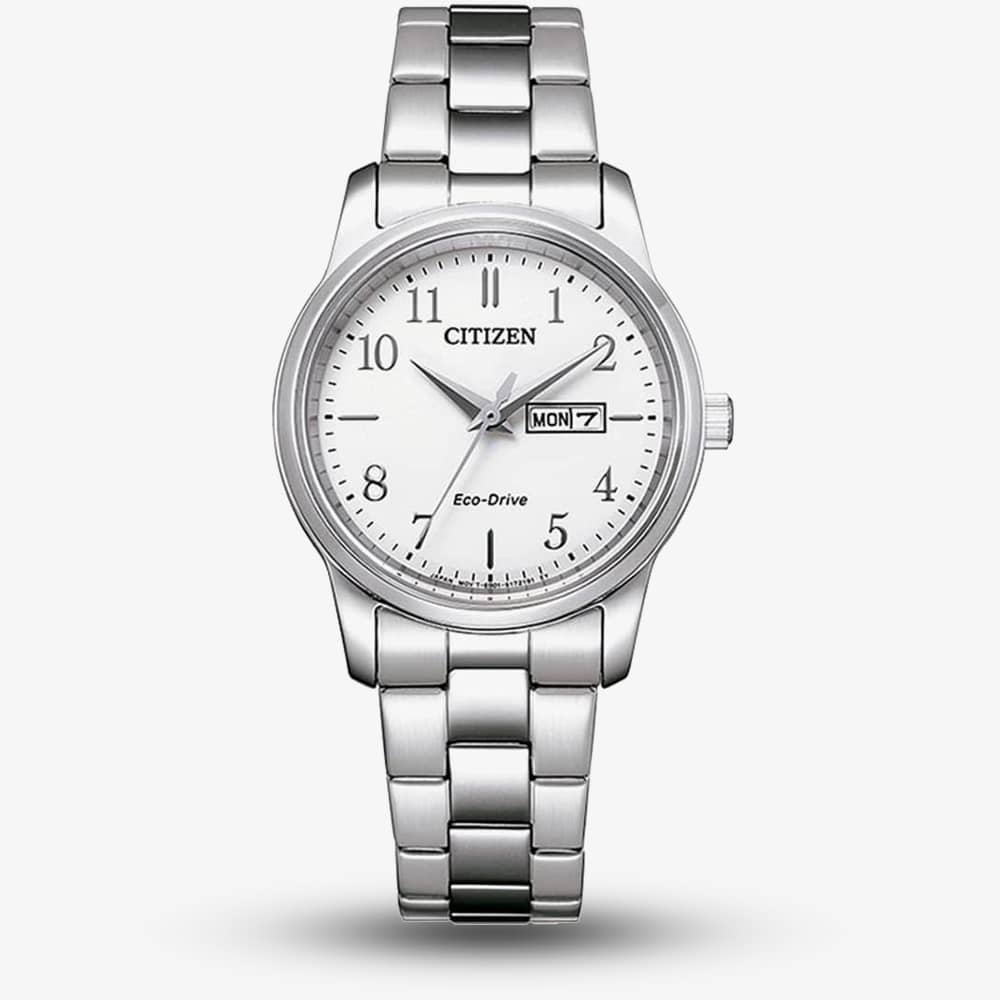The Citizen EW3261-57A Eco-Drive watch combines a 30mm round shaped stainless steel case and bracelet with a fold over clasp. It has a white analogue dial with a day/date display which is protected beneath mineral crystal glass. Power is generated by the eco-drive movement which harnesses light from any source. This model is also splash resistant.