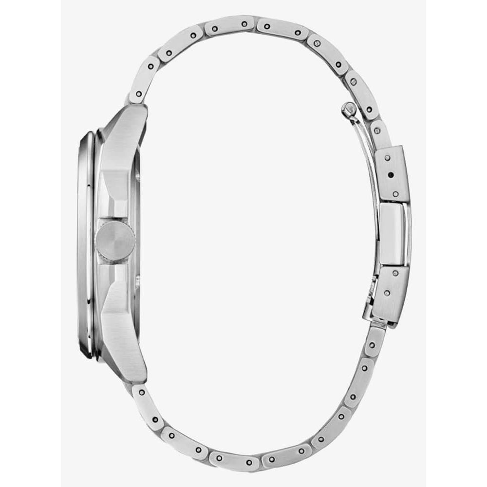 The Citizen Mens Eco Drive 42mm Black Dial AW1720-51E watch combines a 42mm round shaped stainless steel case and silver stainless steel bracelet with a fold over clasp. It has a black analogue dial with luminescent hands, date display which is protected beneath mineral crystal glass. Power is generated by the eco-drive movement. This model also has a water resistance of up to 100 metres.