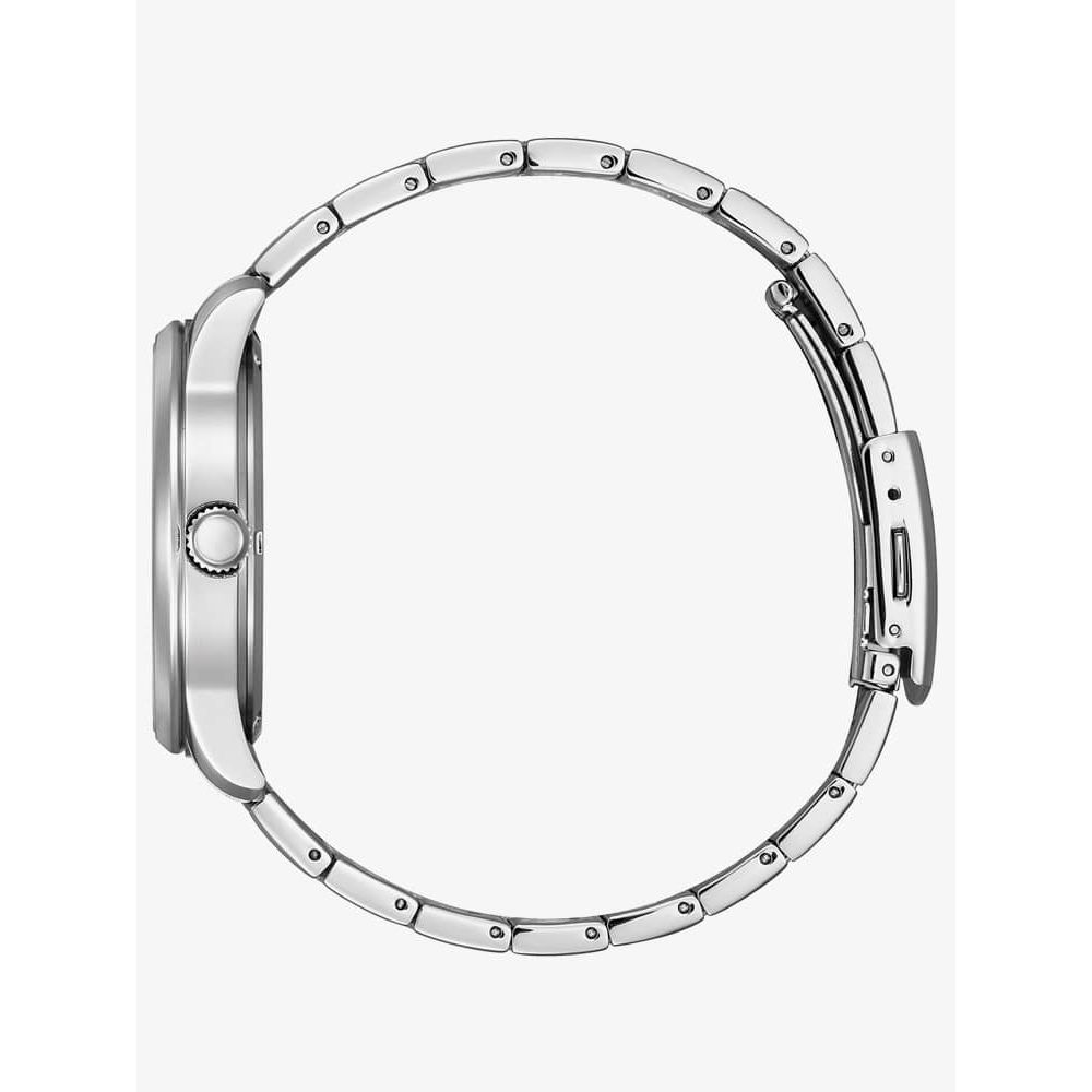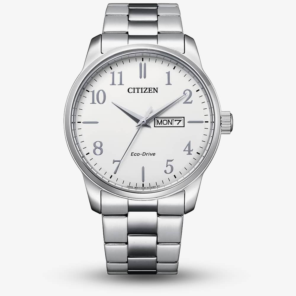The Citizen BM8550-81A Eco-Drive watch combines a 42mm round shaped stainless steel case and bracelet with a push button clasp. It has a white analogue dial with a day/date display which is protected beneath mineral crystal glass. Power is generated by the eco-drive movement which harnesses light from any source. This model also has a water resistance of up to 100 metres.