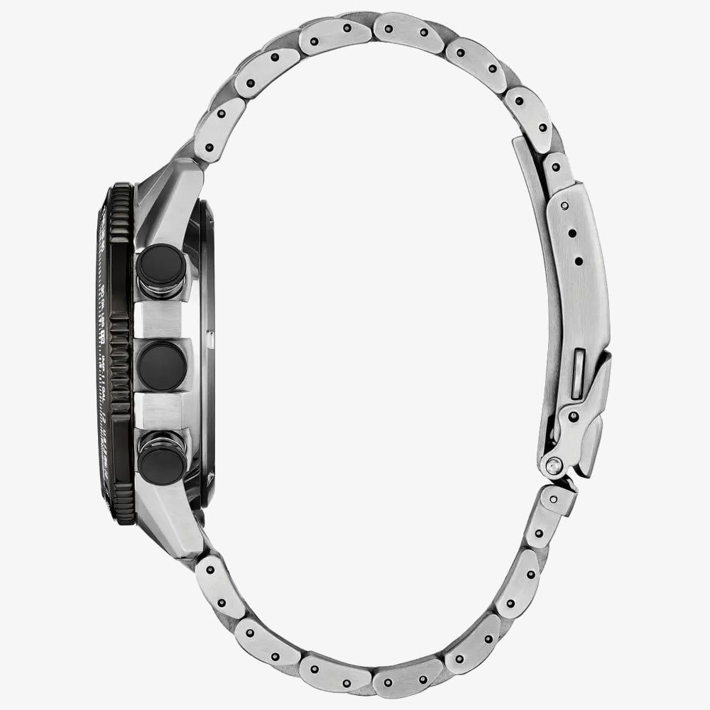 Take your timekeeping to new heights with the Citizen Promaster Skyhawk. Featuring a robust 43mm silver-tone stainless steel case and a striking grey analogue-digital dial, this chronograph blends aviation-inspired design with cutting-edge functionality. A rotating slide-rule bezel, sapphire crystal, and triple-link bracelet add a refined, sporty edge. With features like a perpetual calendar, 1/100-second chronograph, 99-minute countdown timer, alarm, and 200m water resistance, this watch is ready for anything, on the ground or in the air.