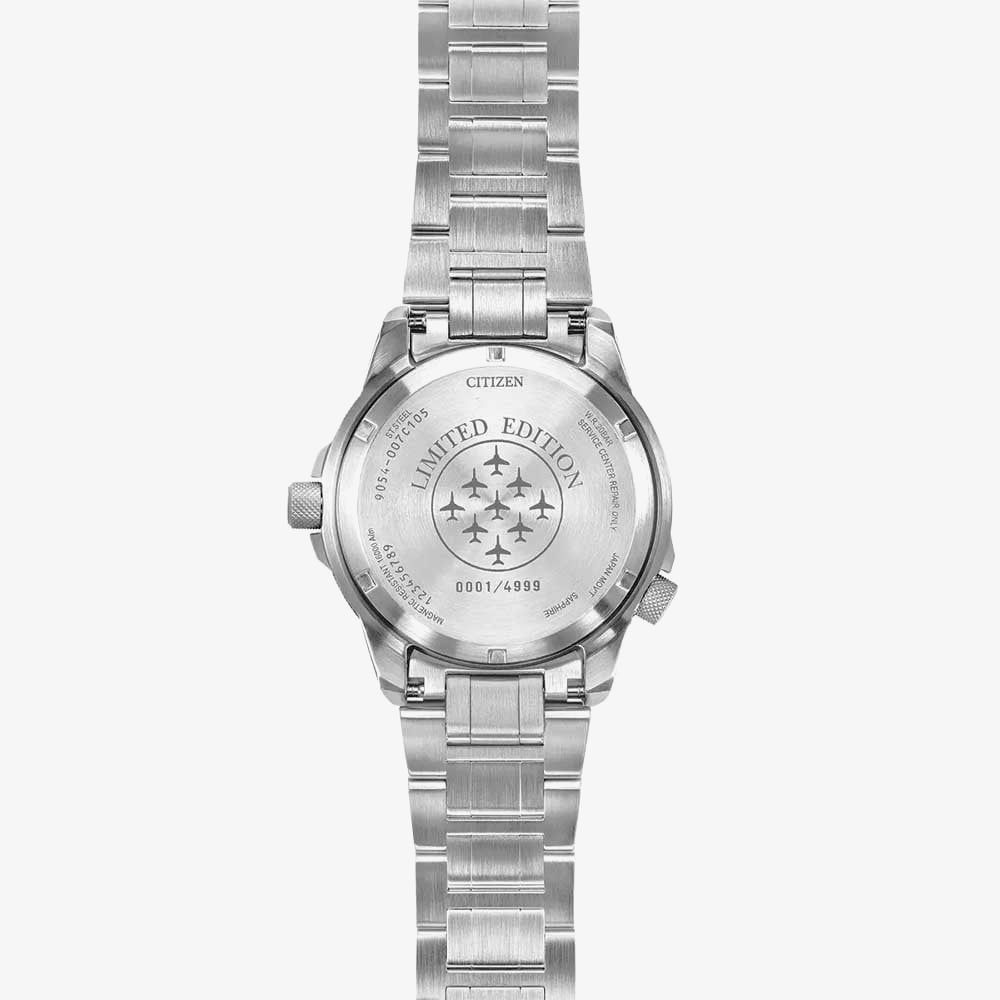 In celebration of the RAF Red Arrows' 60th display season, Citizen proudly presents the Limited Edition Red Arrows Promaster Automatic GMT flight-ready timepiece. This mission-focused powerhouse features a robust stainless steel case with a 24-hour bezel and two bold crowns. The black sunray dial showcases luminous hands and markers, along with the official RAF Red Arrows logo. An aeronautical slide-rule scale encircles the display and is operated by an 8 o'clock crown, complemented by a red-accented 24-hour hand that allows for dual time zone display.