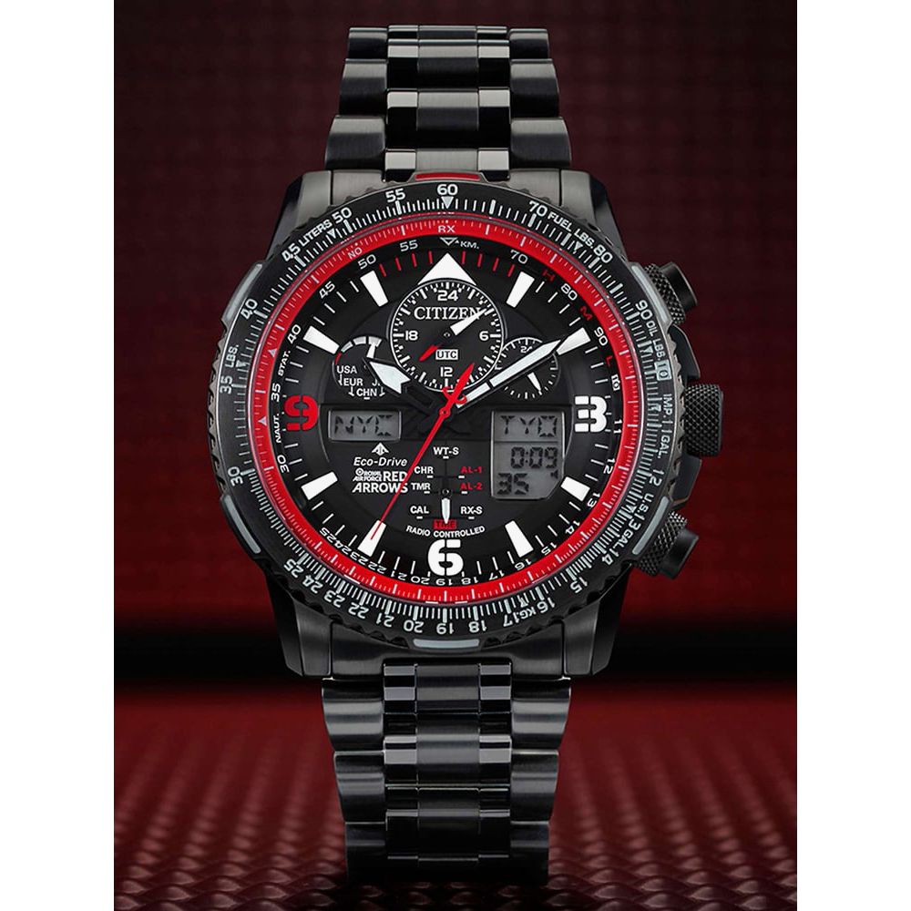 This radio controlled Limited Edition Red Arrows Skyhawk A-T watch is sure to stand out on the wrist! Being crafted with a grey ion plated stainless steel case and bracelet with an eye catching black and red dual display dial. This model features a vast array of useful functions including world time in 43 cities, a 1/100 second chronograph measuring up to 24 hours, perpetual calendar, 2 alarms, 99 minute countdown timer, dual time, digital display light, UTC display, power reserve indicator and a pilot’s rotating slide rule bezel. Additionally this watch is powered by Eco-Drive technology meaning it is powered by any light and never needs a battery.