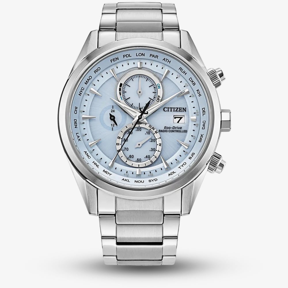 The Citizen Radio Control AT8267 blends advanced technology with stylish chronograph design. Its 43mm stainless steel case features brushed and polished finishes, complemented by a matching bracelet. The sky blue dial includes a vertical three-register chronograph, silver-tone appliques, and a 3 o’clock date display. Features include world time in 26 zones, a perpetual calendar, and Eco-Drive Atomic Timekeeping, adjusting automatically via radio signals. Water resistant to 100 meters.