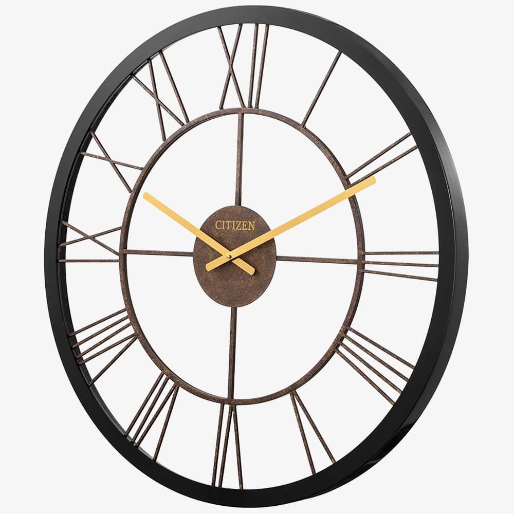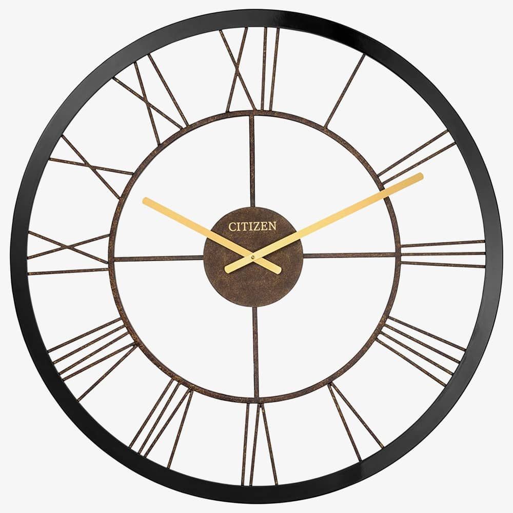 The Citizen CC2042 round shaped Oversized wall clock is made from wood. It has an openwork black dial with gold tone hands and large Roman numerals. This clock also requires 1 x AA battery (not included).