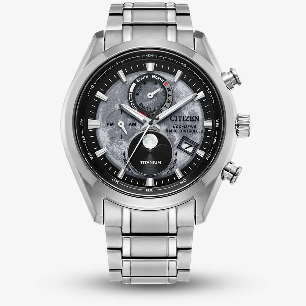 The Tsuki-yomi collection (which translates to “reading the moon”) has a new radio-controlled Eco-Drive Cal. H874 movement that provides ±15 seconds accuracy per month, a revolutionary proprietary Super Titanium case and bracelet, and artfully crafted moon pattern dials. The watch calculates the phase of the moon each day by using signals received from multi-band radio transmitters combined with a unique mathematical formula developed by Citizen called “Luna Program”. The phase of the moon is then automatically adjusted and displayed at the six o’clock position. Sustainably powered by any light, including moon light, with our proprietary Eco-Drive technology, this timepiece never needs a battery.