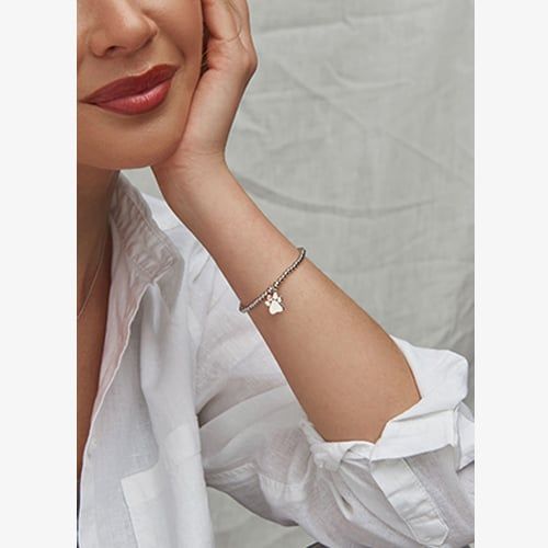 From the Affinity collection, this adorable expandable beaded bracelet has been crafted in sterling silver & rare Welsh 9ct rose gold with a paw print motif set with a sparkling white topaz stone.